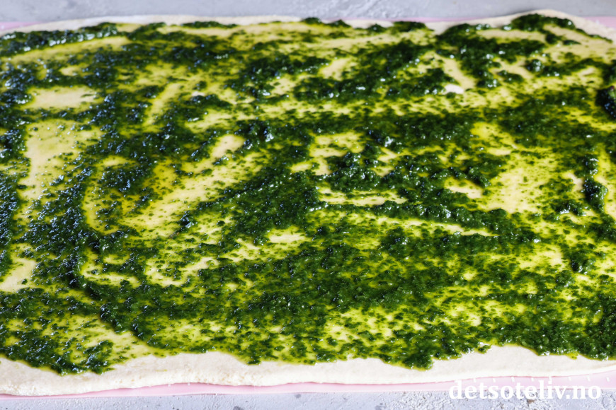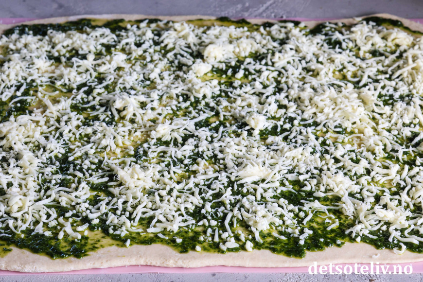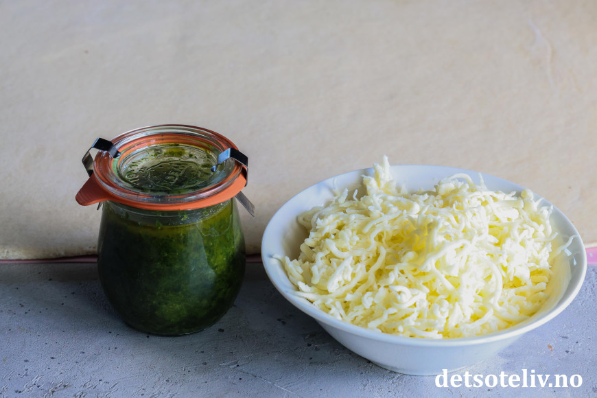 Kjevle ut deigen til et rektangel på ca. 30 x 40 cm. Finn frem ramsløkpuré (hjemmelaget eller ferdigkjøpt) og revet mozzarella.