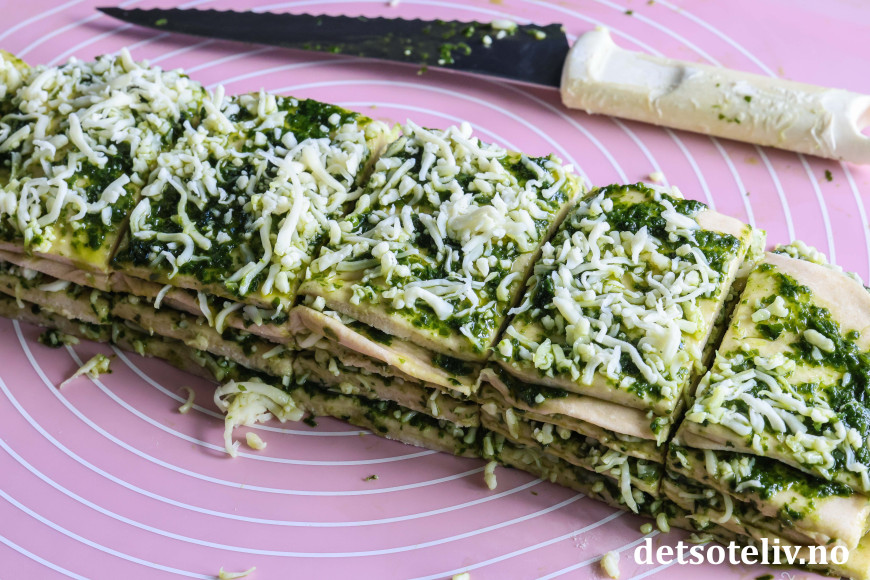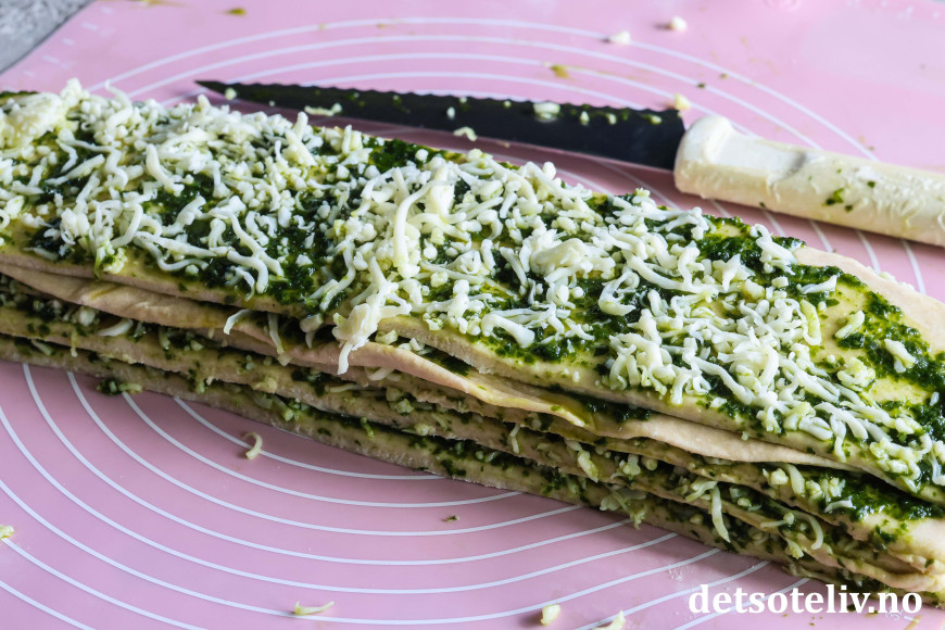Skjær leiven opp i 5 striper på langs og legg dem oppå hverandre, så du får en lang, smal deigkake i 5 lag med fyll mellom.