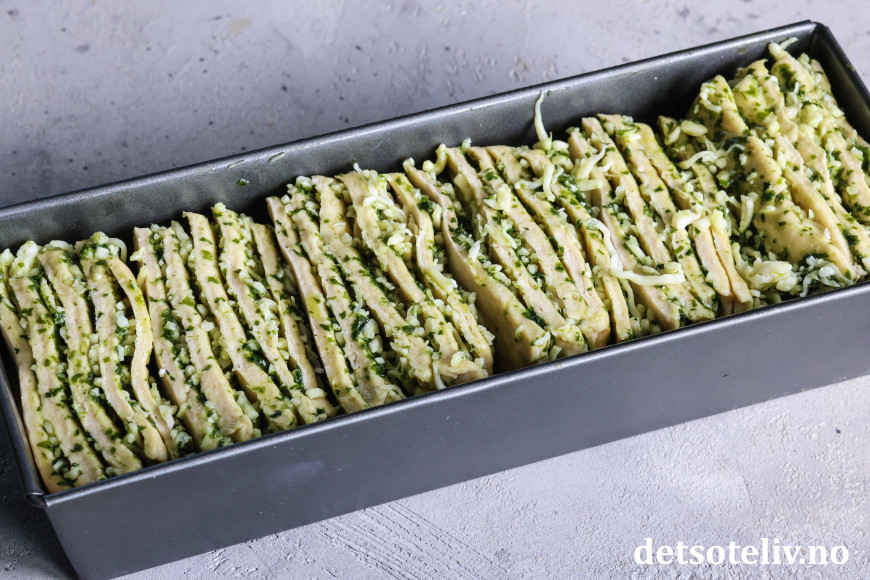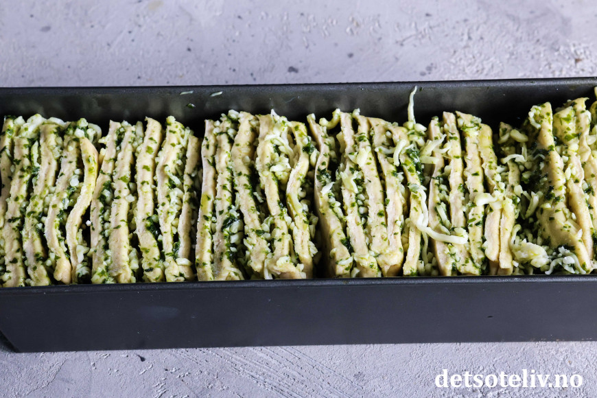 Smør en brødform som rommer 2 liter og legg bakepapir i bunnen. Sett bunkene med deiglapper etter hverandre i brødformen med snittflaten vendene opp.