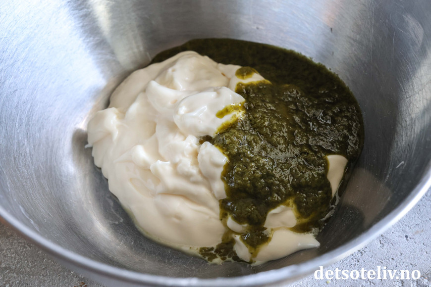 Ramsløkmajones lager du enkelt ved å røre majones sammen med ramsløkpuré (smak deg frem til ønsket mengde), og eventuelt en klype flaksalt.