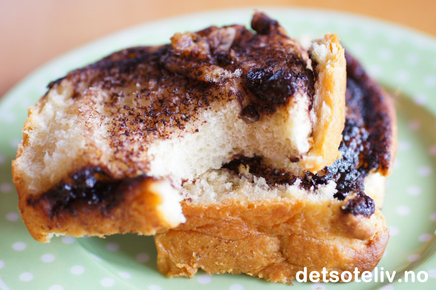 Mmmm... varm gjærbakst fylt med sjokolade og valnøtter....