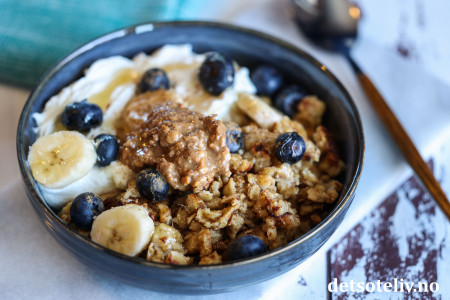 Deilig for eksempel sammen med yoghurt, banan og blåbær. Topp med kanel, flytende honning og peanøttsmør!