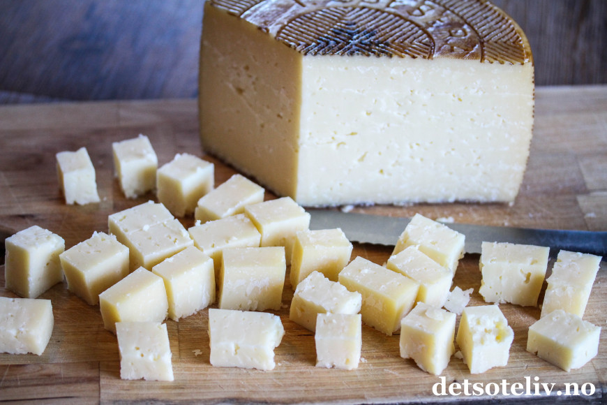 Del manchego-osten i terninger. Det er ikke så nøye hvor store de er, men terningene bør ikke være alt for små, for da kan osten lett smule seg opp. Ca. 2 x 2 cm er passe.