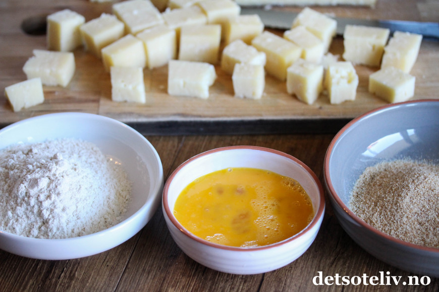 Vend ostebitene første i hvetemel, så i egg og deretter i griljermel. La de panerte ostebitene stå kaldt i 30 minutter.
