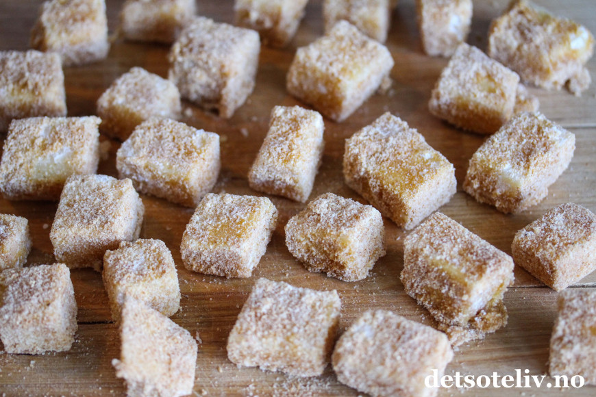 Vend ostebitene første i hvetemel.