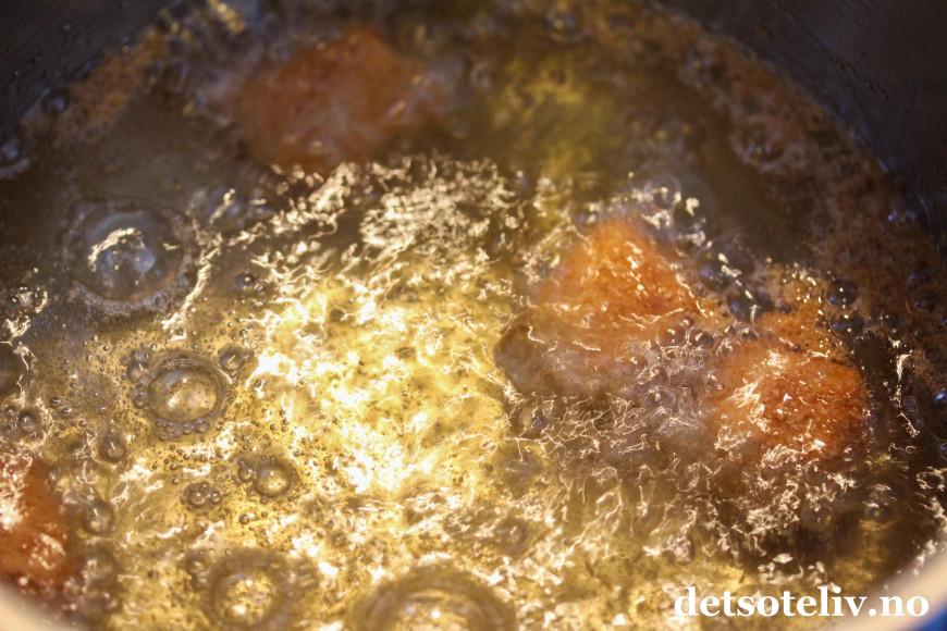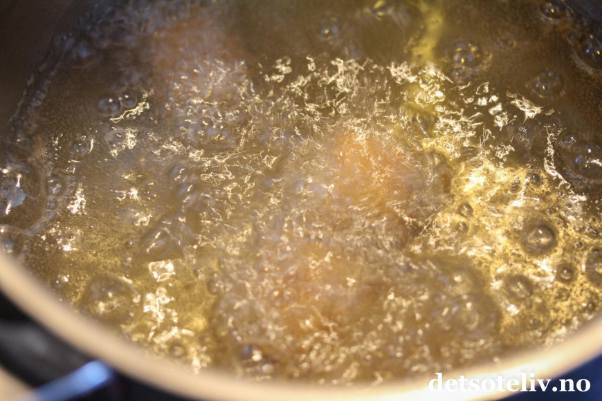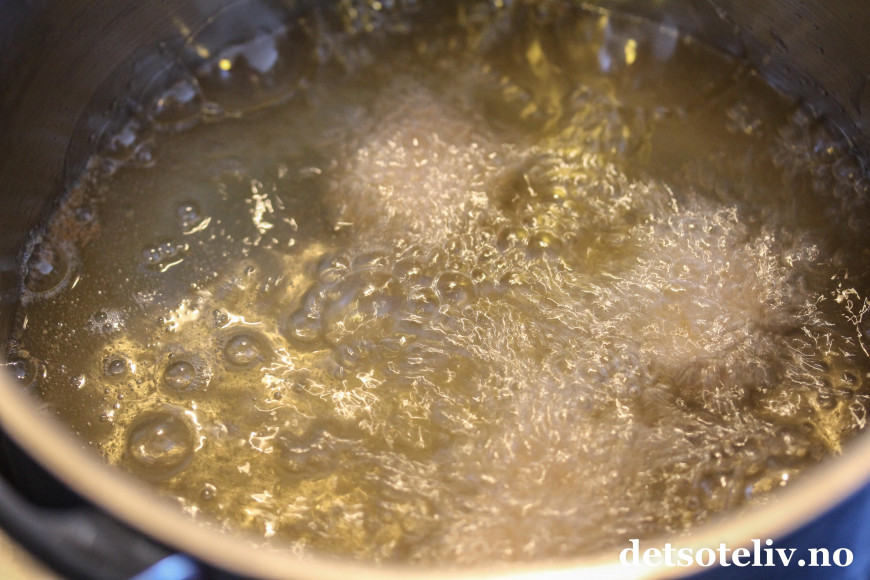 ♥ Husk å være ekstra forsiktig med varm olje så du ikke skader deg. Ha alltid et lokk i nærheten slik at du kan legge lokket på kjelen dersom oljen skulle ta fyr. Aldri hell vann i kjelen!