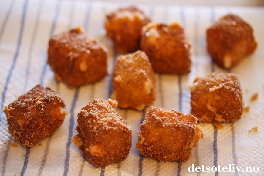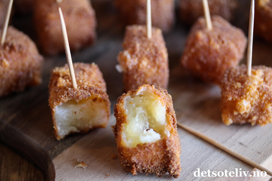 Bruk en hullsleiv av metall og legg noen panerte ostebiter forsiktig ned i den varme oljen. Jeg synes det er passe å steke 5-6 ostebiter av gangen slik at varmen på oljen holder seg. Du vil straks se at oljen bruser opp rundt ostebitene. La ostebitene steke en liten stund i oljen. Vend litt rundt på dem så de blir jevnt stekt. Følg nøye med, for de trenger ikke mange minuttene før de er ferdigstekte.