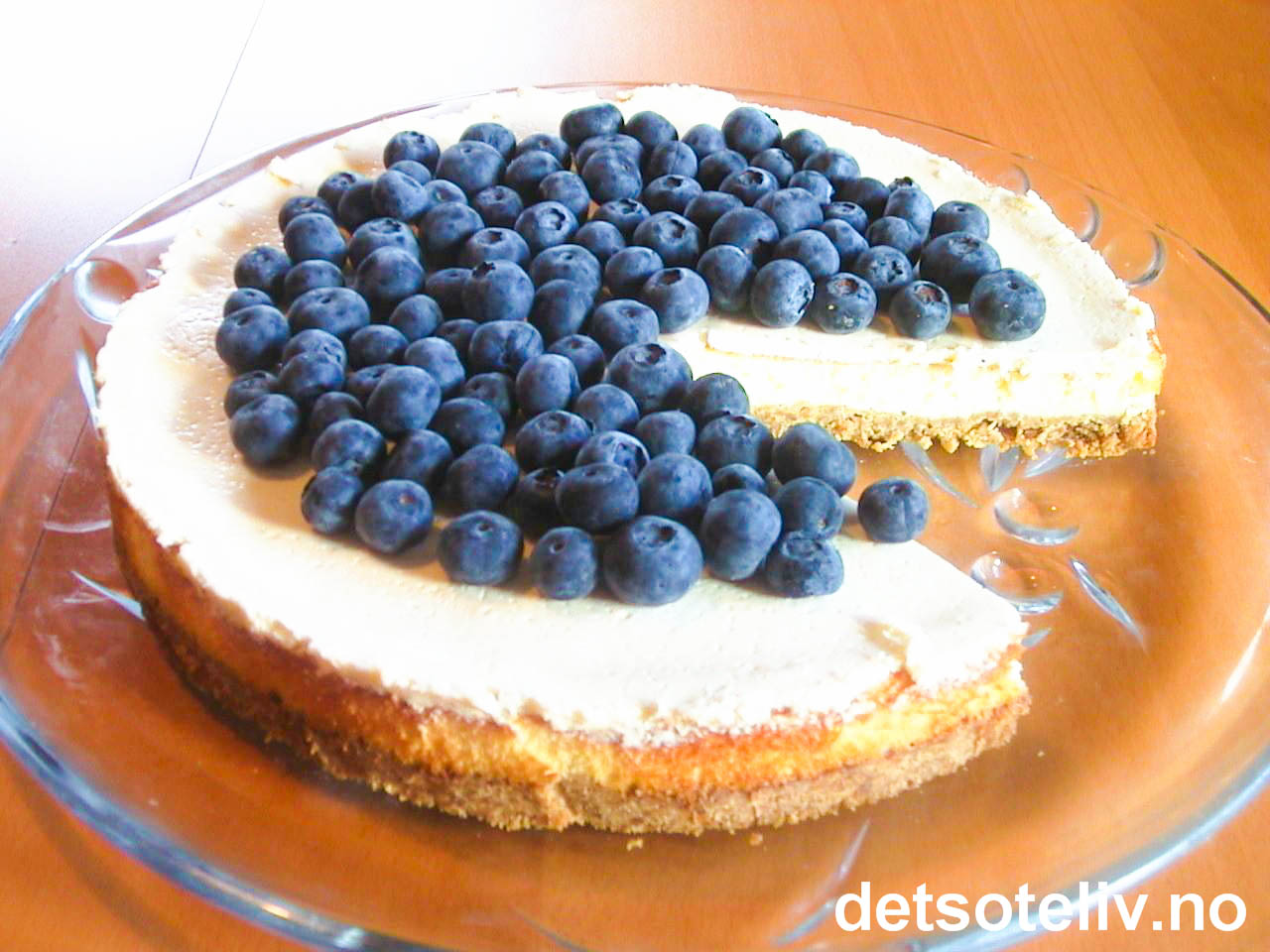 Hell ostefyllet over kjeksbunnen i kakeformen. Stek kaken midt i ovnen ved 175°C i 35 min. Ta kaken ut av ovnen og avkjøl.