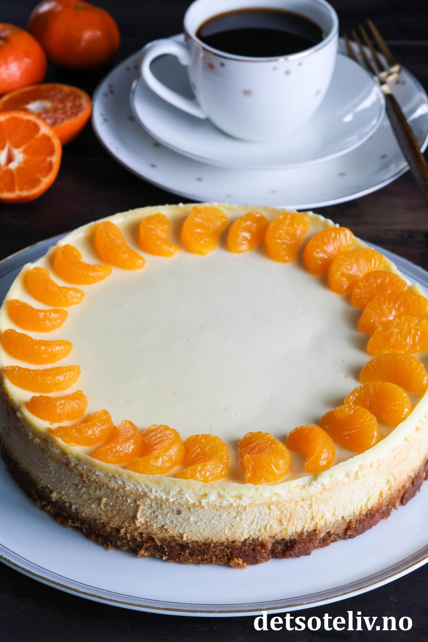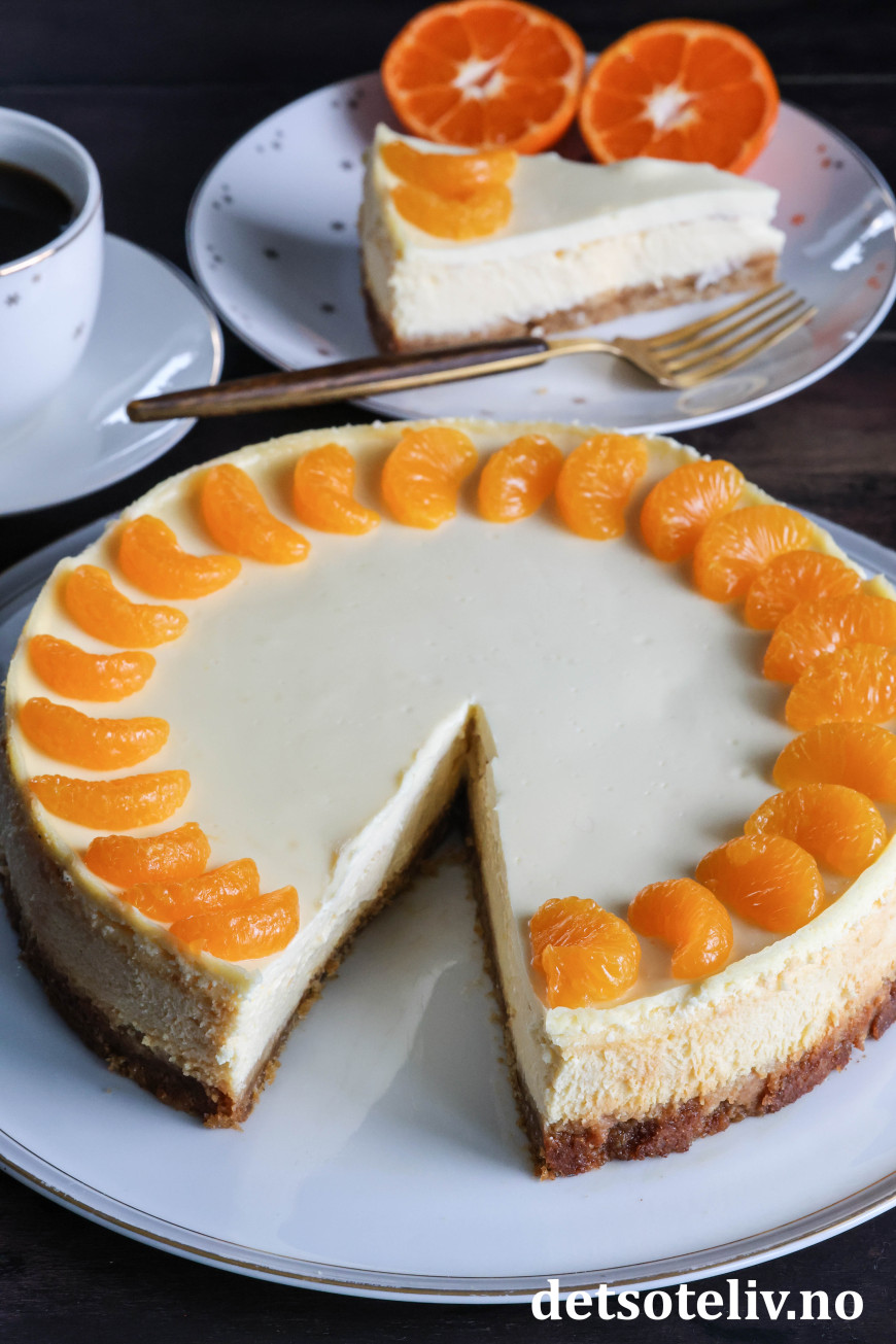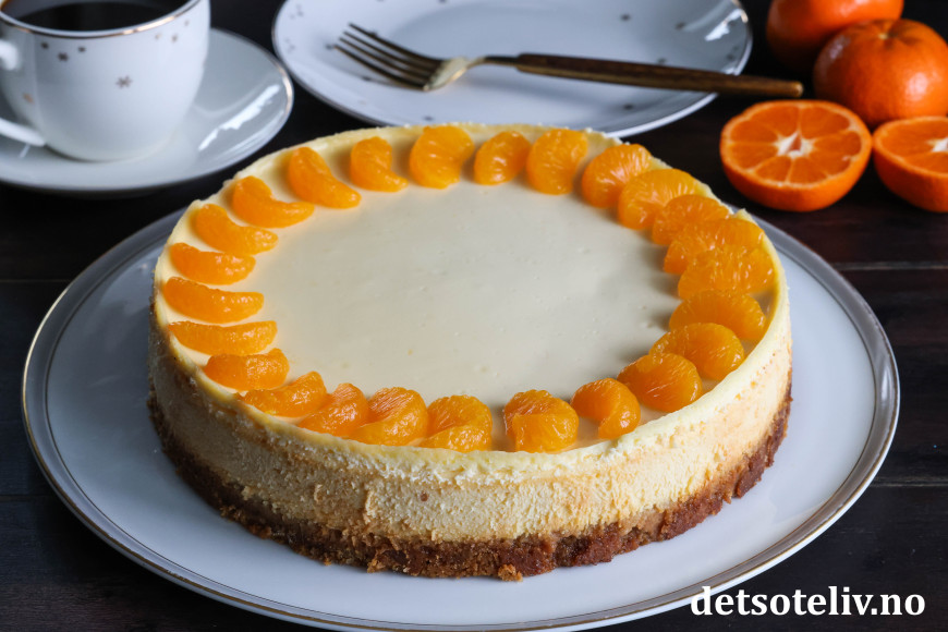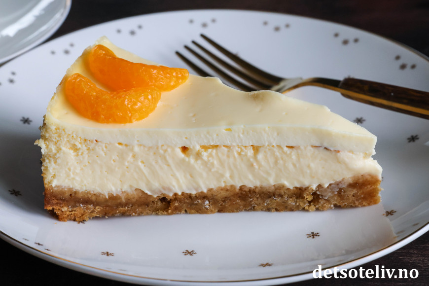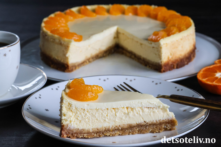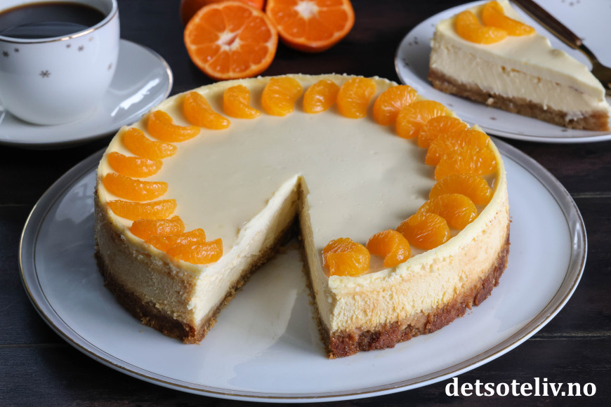 Dette er stekt ostekake (amerikansk cheesecake) med deilig, tropisk smak. Jeg bruker kremost med smak av mandarin og ananas til ostefyllet i tillegg til presset saft og revet skall fra saftige appelsiner. Pynten er hermetiske mandarinbåter.