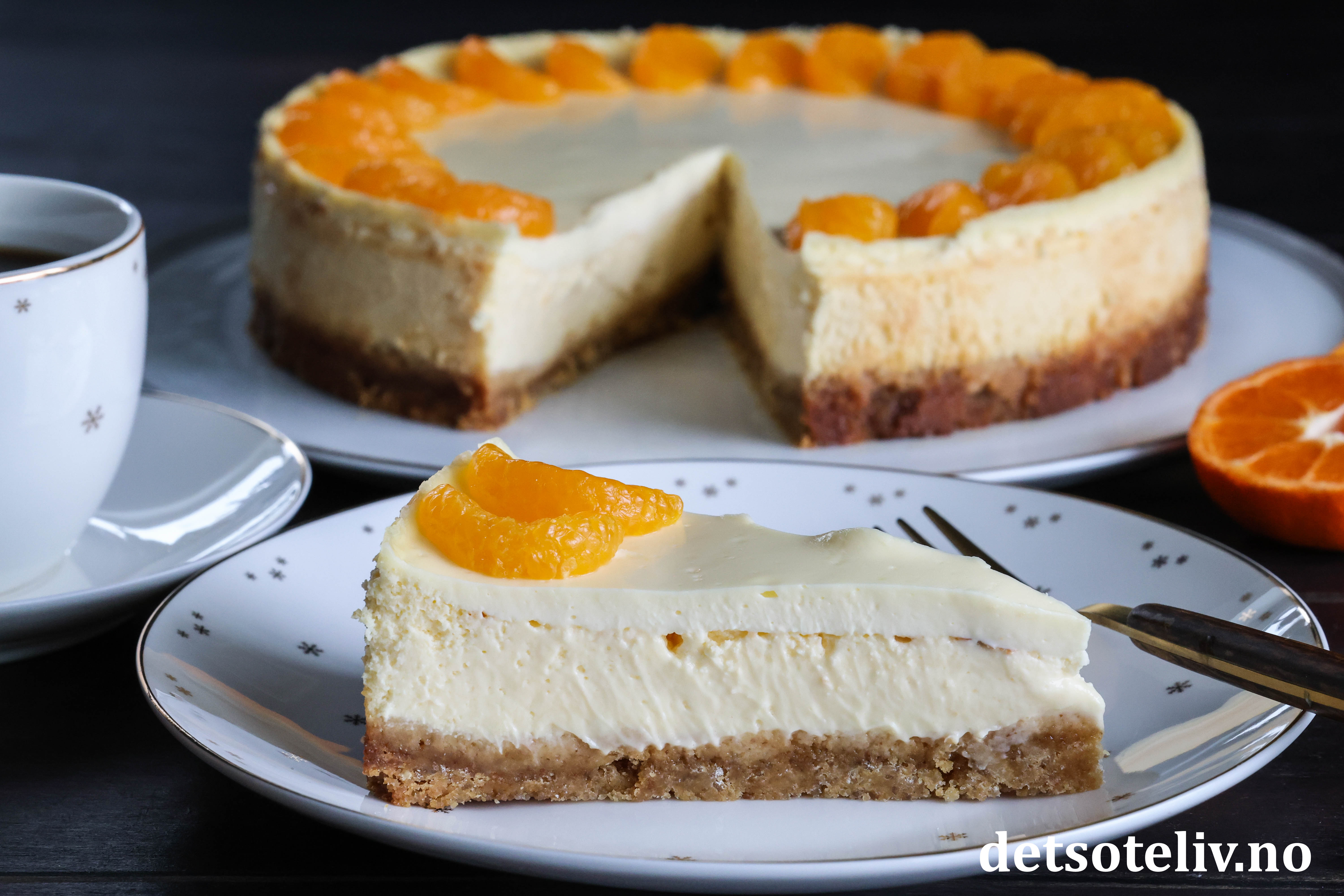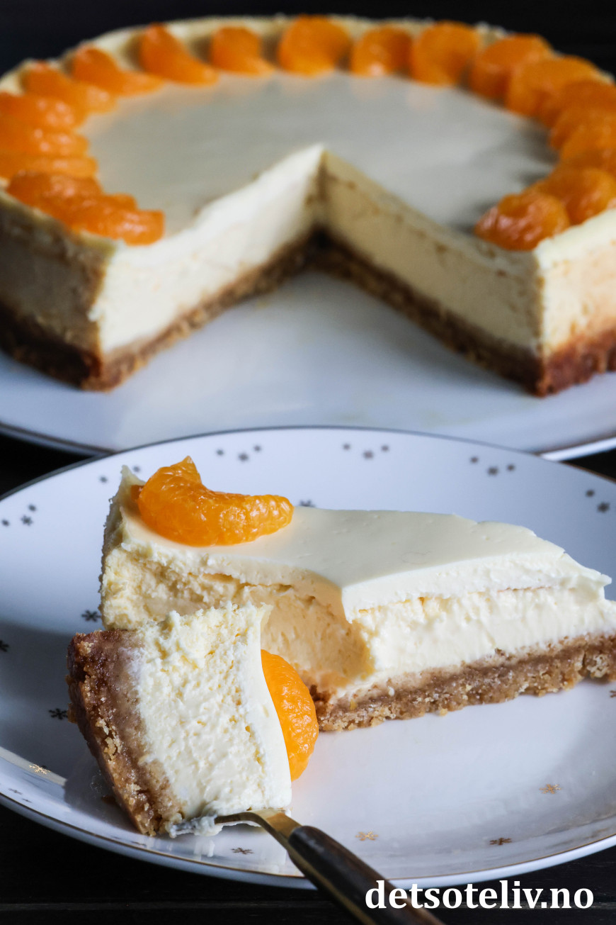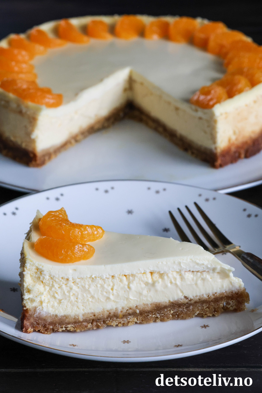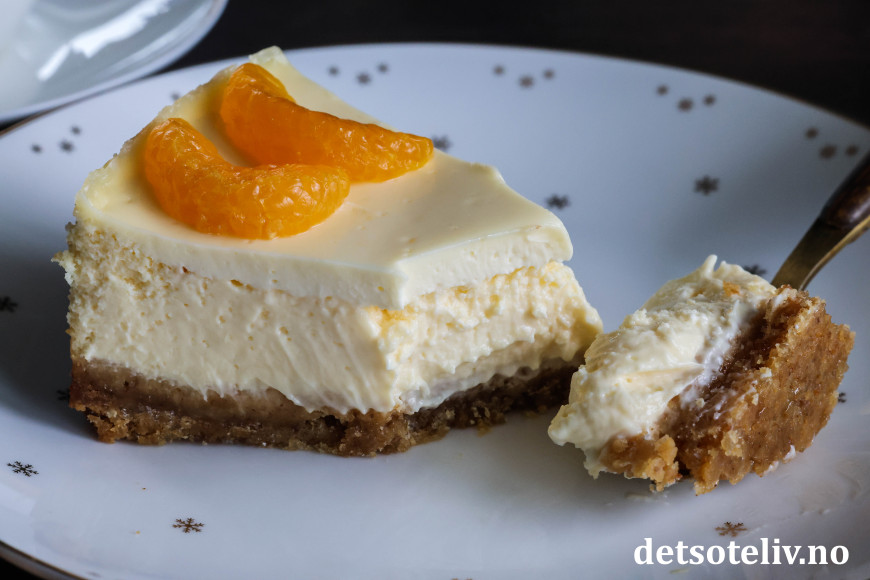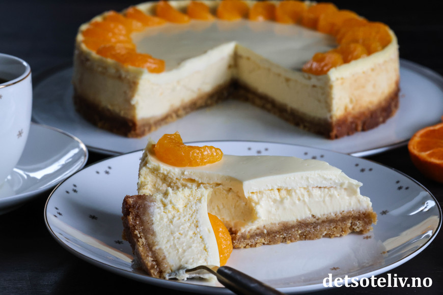 Dette er stekt ostekake (amerikansk cheesecake) med deilig, tropisk smak. Jeg bruker kremost med smak av mandarin og ananas til ostefyllet i tillegg til presset saft og revet skall fra saftige appelsiner. Pynten er hermetiske mandarinbåter.