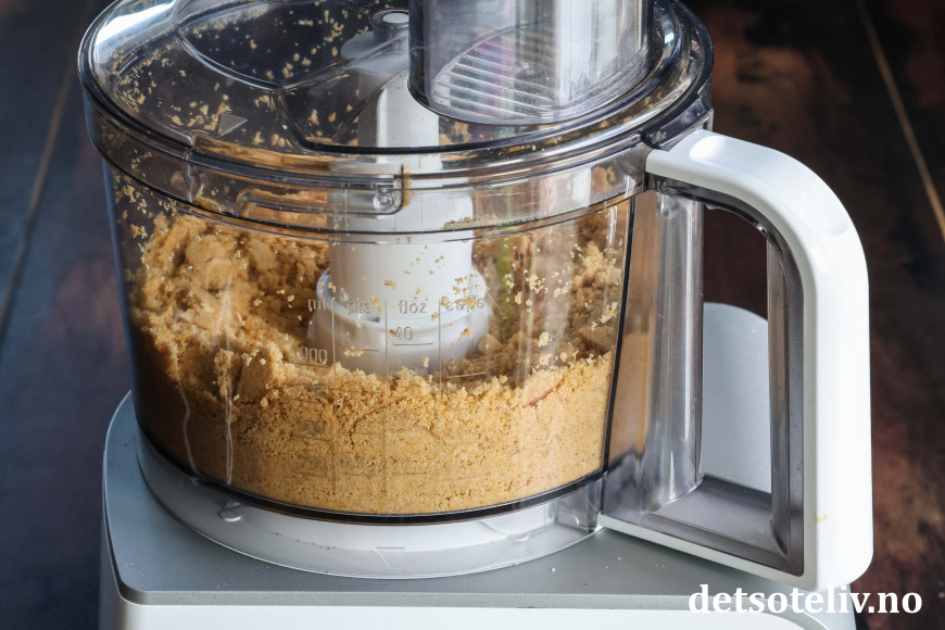Knus Digestivekjeks og bland kjekssmulene med brunt sukker. Smelt smøret og ha i.