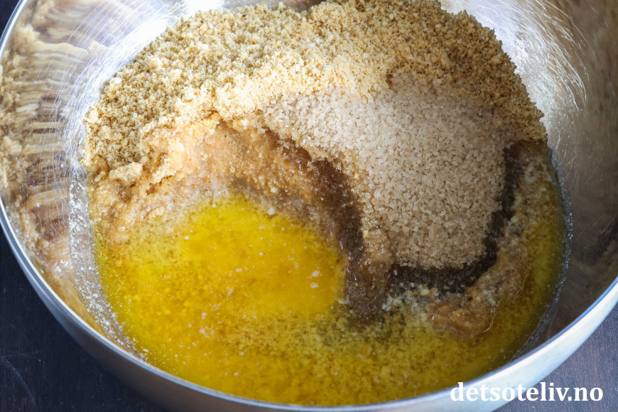 Knus Digestivekjeks og bland kjekssmulene med brunt sukker.