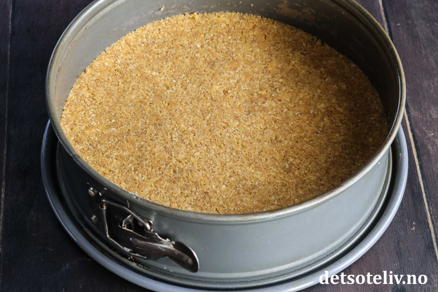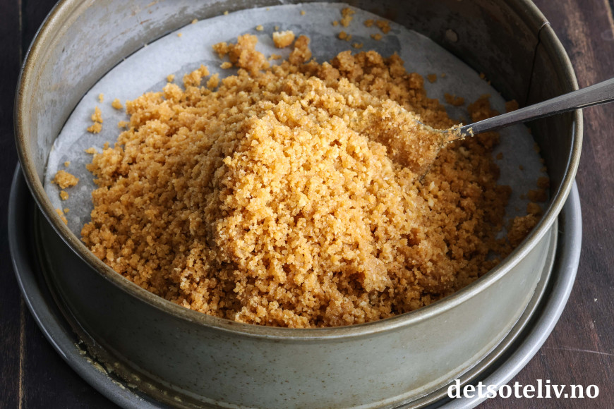 Trykk blandingen utover i bunnen på en smurt kakeform (24 cm i diameter) med bakepapir i bunnen.