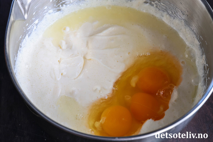 Visp deretter inn eggene (rør minst mulig så det ikke danner seg luft i ostemassen).