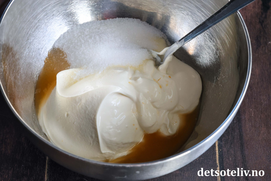 Rør sammen ingrediensene til toppingen.