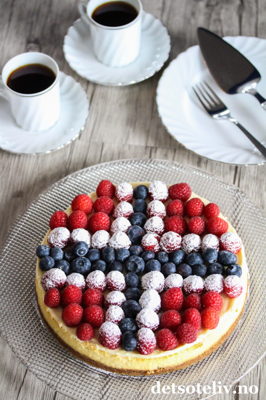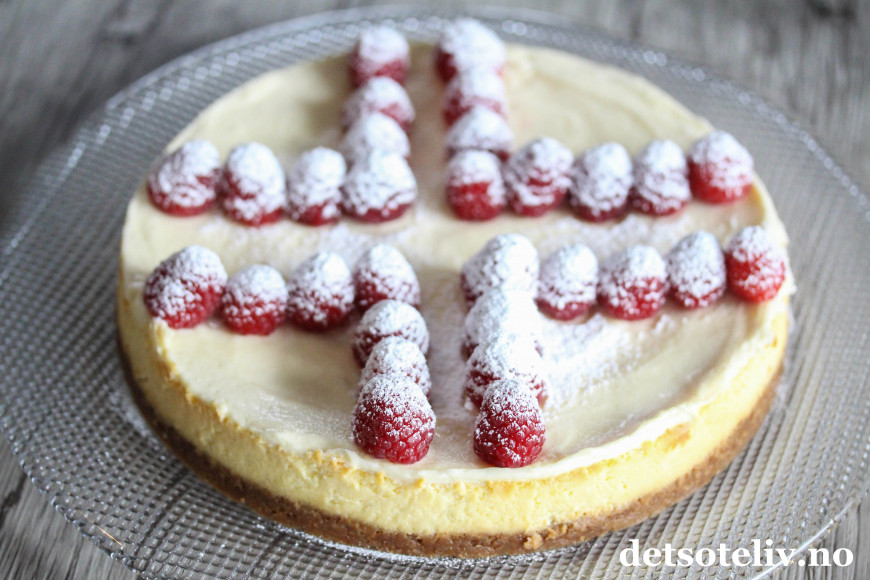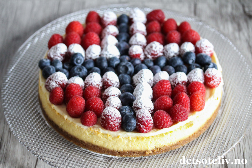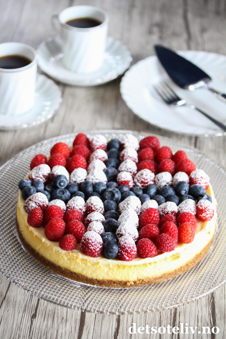 En kake jeg har latt meg inspirere av er denne bakte ostekaken. Jeg synes det er en så fin idé å lage et norsk flagg på toppen av kaken med blåbær og bringebær, som delvis drysses med melis så de blir hvite.