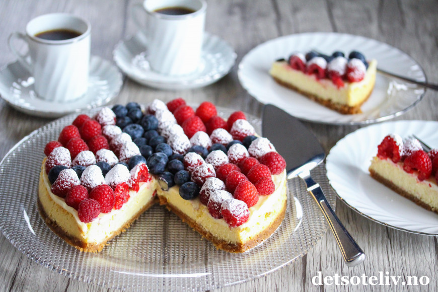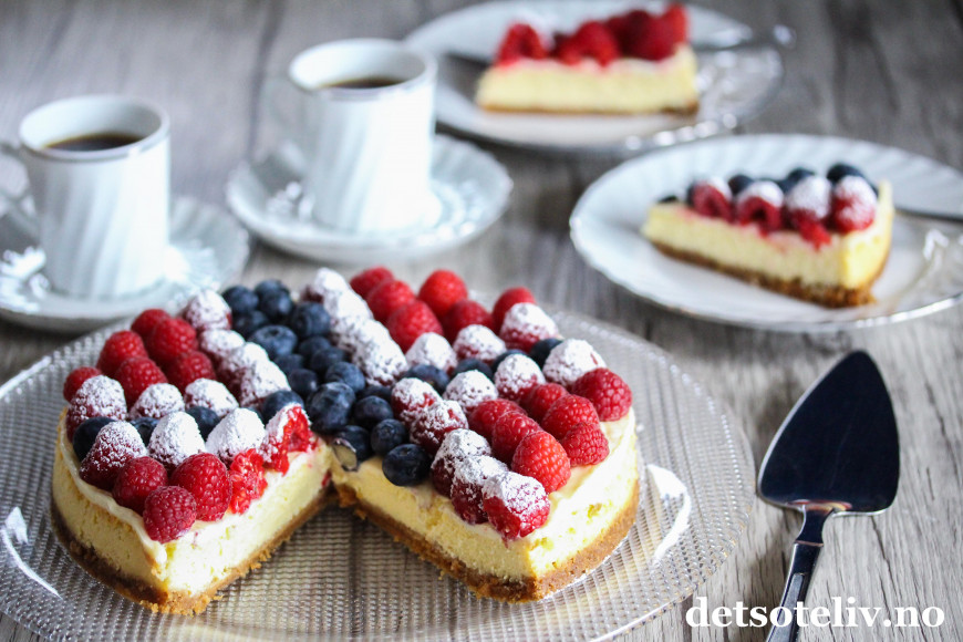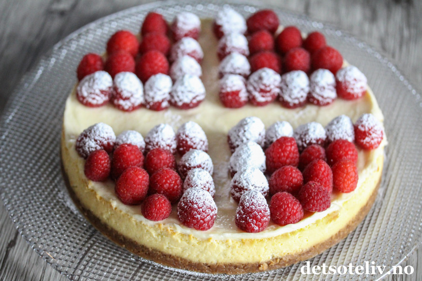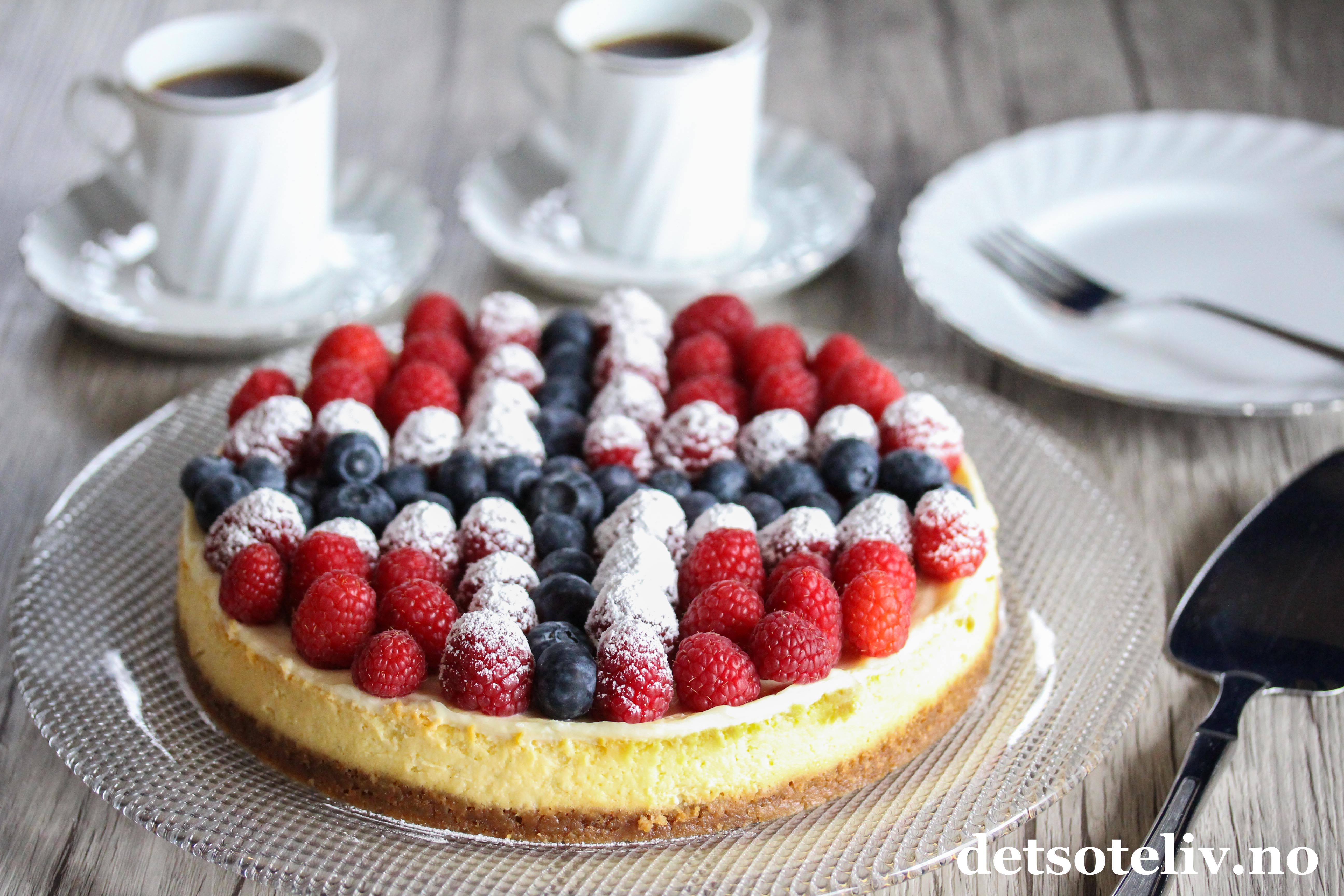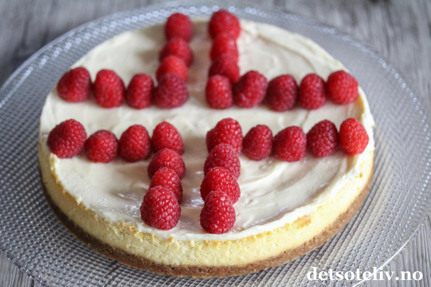 En kake jeg har latt meg inspirere av er denne bakte ostekaken. Jeg synes det er en så fin idé å lage et norsk flagg på toppen av kaken med blåbær og bringebær, som delvis drysses med melis så de blir hvite.