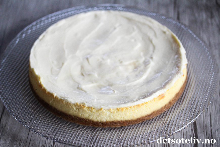 Ta kaken ut av ovnen. Rør sammen crème fraîche og sukker. Fordel blandingen på toppen av ostekaken. Sett formen i kjøleskapet og la kaken helst stå der til dagen etter (se tips).
