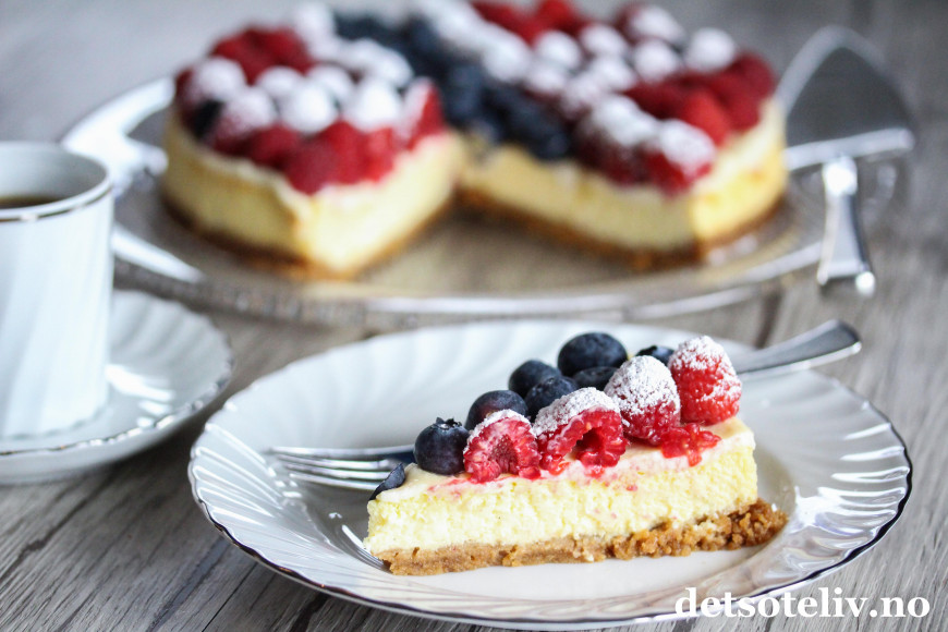 Ostekaken er en klassisk, amerikansk ostekake som stekes i ovnen. Den blir søt, kremete og mektig, noe som passer veldig godt sammen med de litt syrlige bærene på toppen.