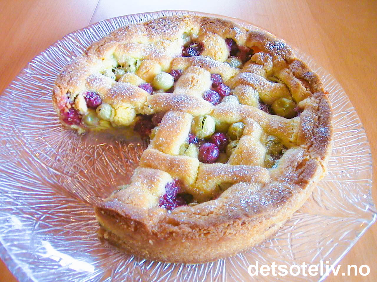 Trykk 2/3 av deigen ut i bunn og kanter på en smurt, rund kakeform (24 cm i diameter) med bakepapir i bunnen. Ha i den avkjølte eggekremen. Legg rensede stikkelsbær oppå eggekremen. Bland sammen sukker og potetmel og dryss over bærene. Lag gitter på toppen av kaken med resten av deigen.
