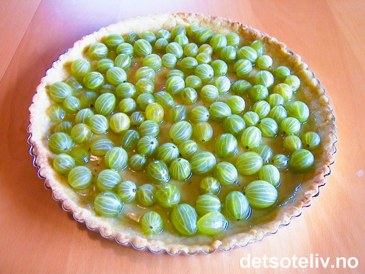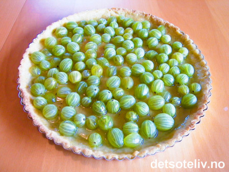 Fordel rensede stikkelsbær i paien. Øs den tyktflytende geléen forsiktig over bærene (se tips). Sett paien i kjøleskapet til geléen har stivnet helt.