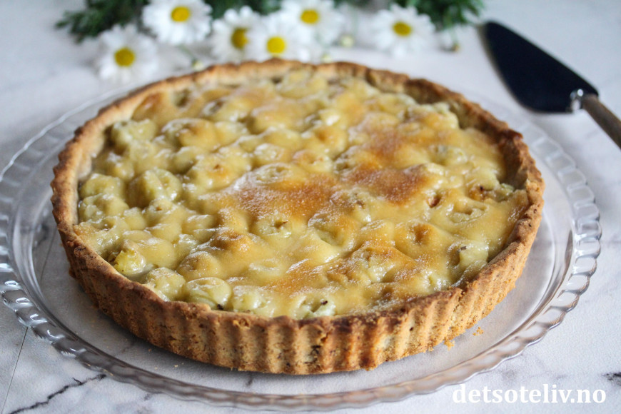 Her har du en av de beste paiene jeg noen gang har smakt! Paien består av en nydelig mørdeigsbunn med nøtter og syrlig stikkelsbærfyll som er dekket med en karamellisert sirupsglasur!