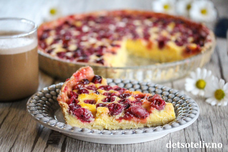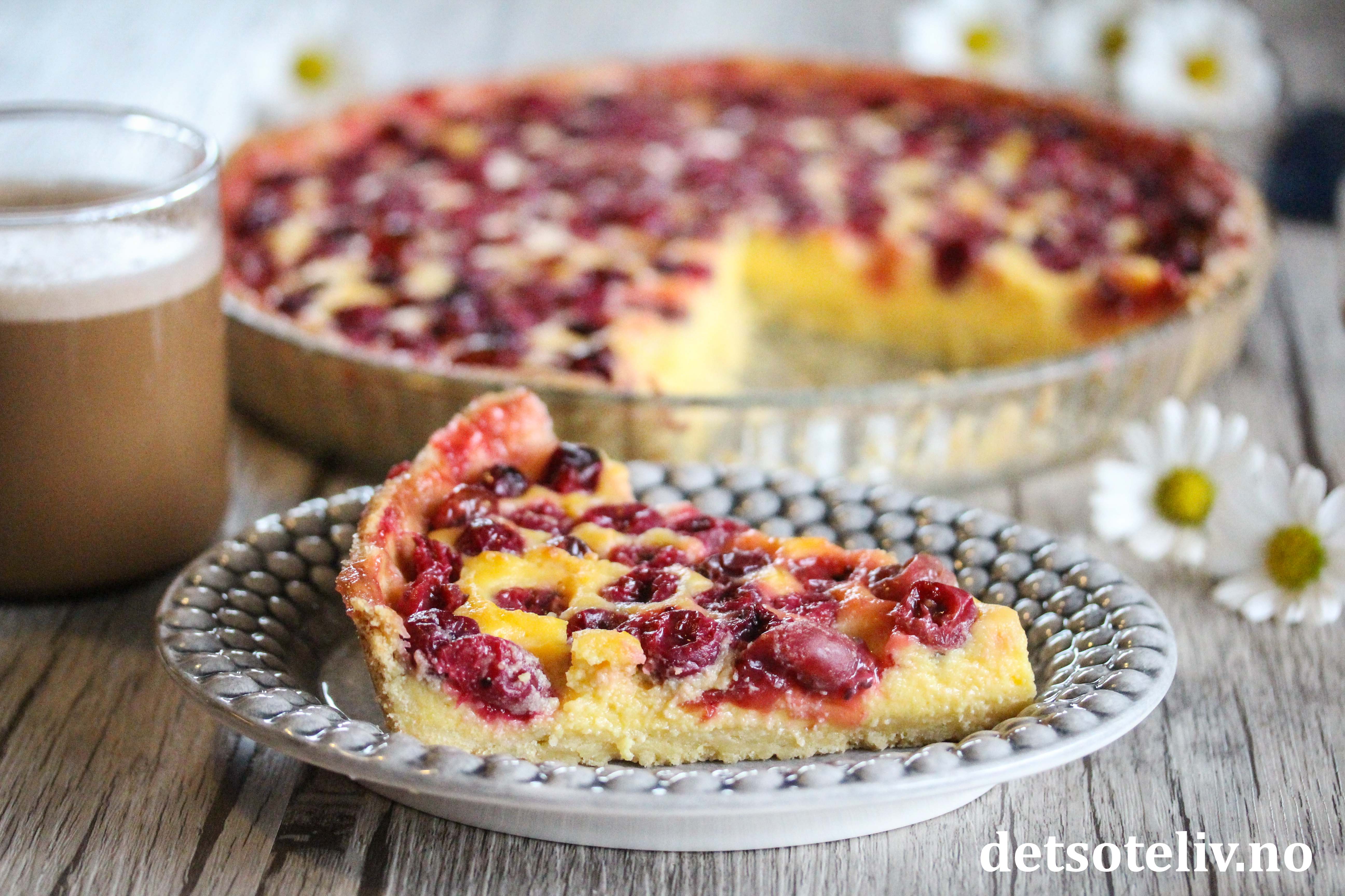 Her har du en lekker, fransk pai med kremete kesam- og vaniljefyll og syrlige, røde stikkelsbær!