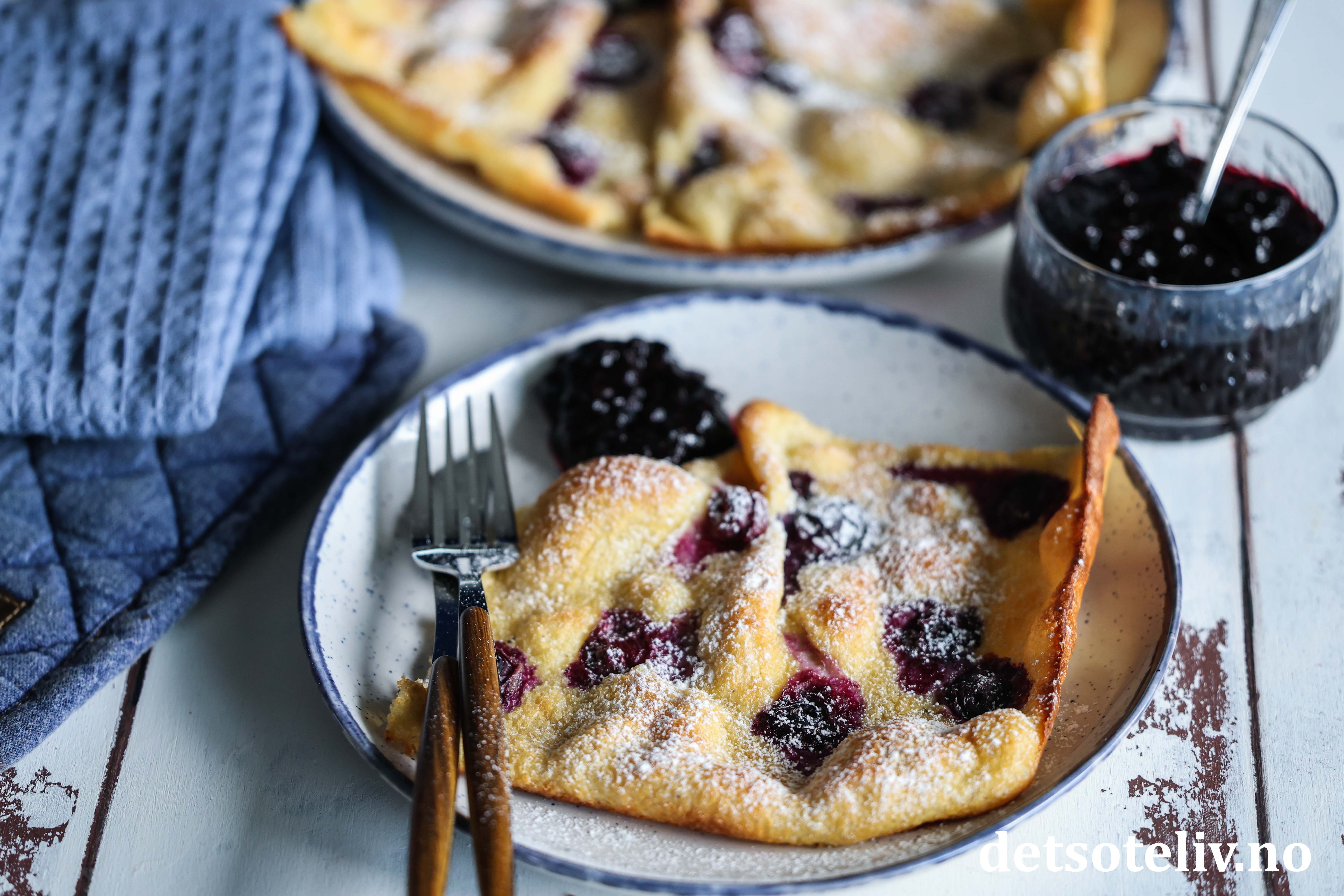 Stor blåbærpannekake stekes i stor langpanne og er ferdig i en fei!