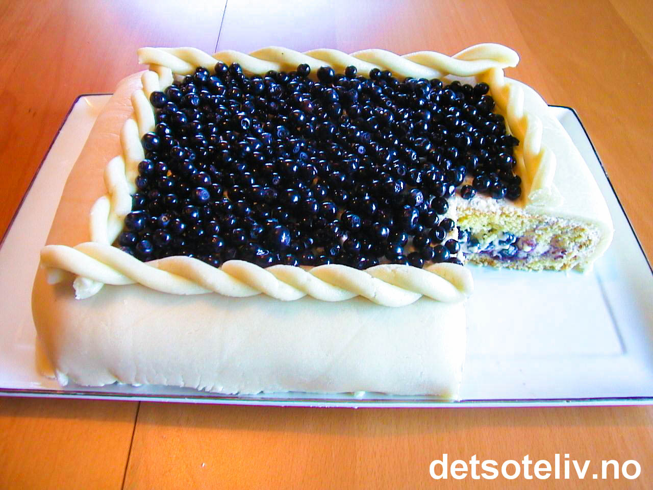 Hvis du vil pynte kaken som på bildet gjør du således: Klipp til en firkant av matpapir eller bakepapir som er litt mindre enn kaken og legg på toppen av den fylte kaken etter at du har dekket den med krem. Kjevle ut et stort marsipanlokk og dekk over hele kaken. Jevn til kantene. Skjær ut en firkant av marsipanen midt på kaken. Løft opp marsipanfirkanten og fjern matpapiret under. Bruk marsipanrestene til å trille ut tynne pølser som tvinnes sammen. Legg dette som en kant rundt den indre firkanten på kaken. Fyll firkanten på toppen av kaken med resten av blåbærene.