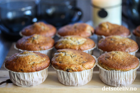 Se også oppskrift på "Bananmuffins med nøtter" og "Bananmuffins med sjokolade og mandler".