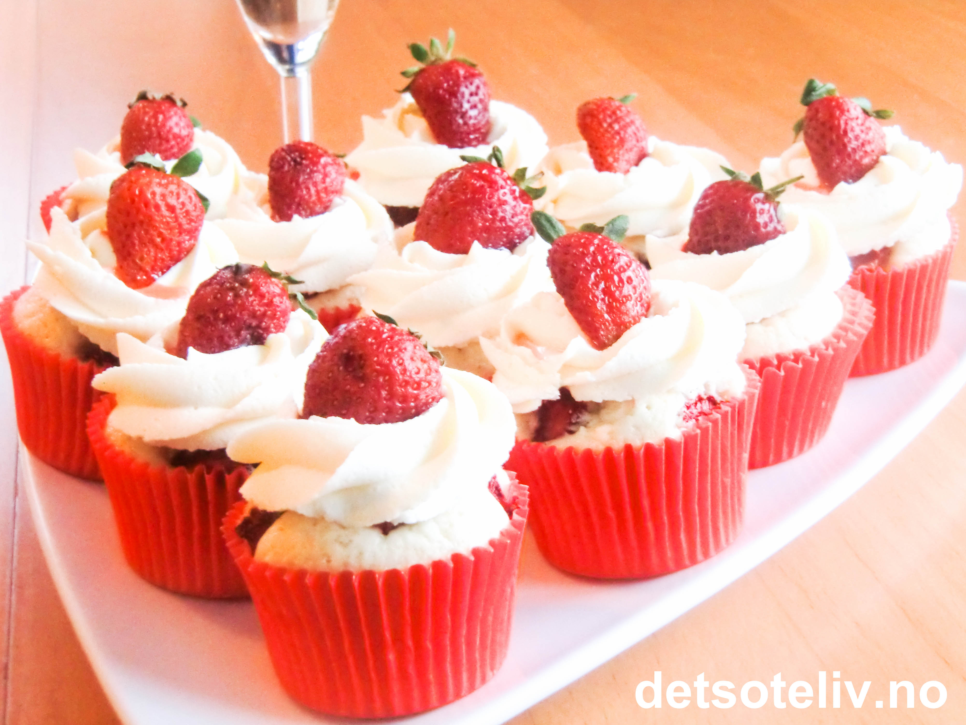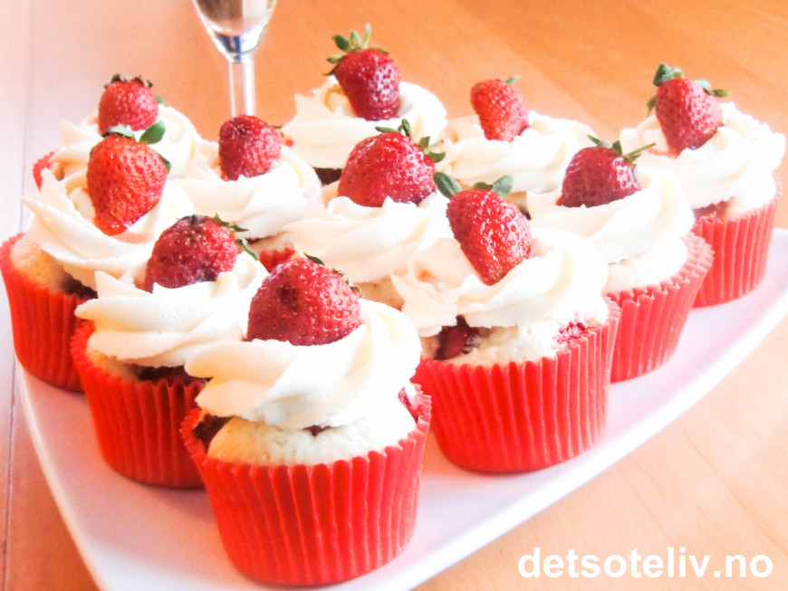 Pisk sammen en luftig frosting av mykt smør, melis, vaniljeessens og kremfløte. Sprøyt topper på hver cupcake og pynt med et halvt jordbær på hver.