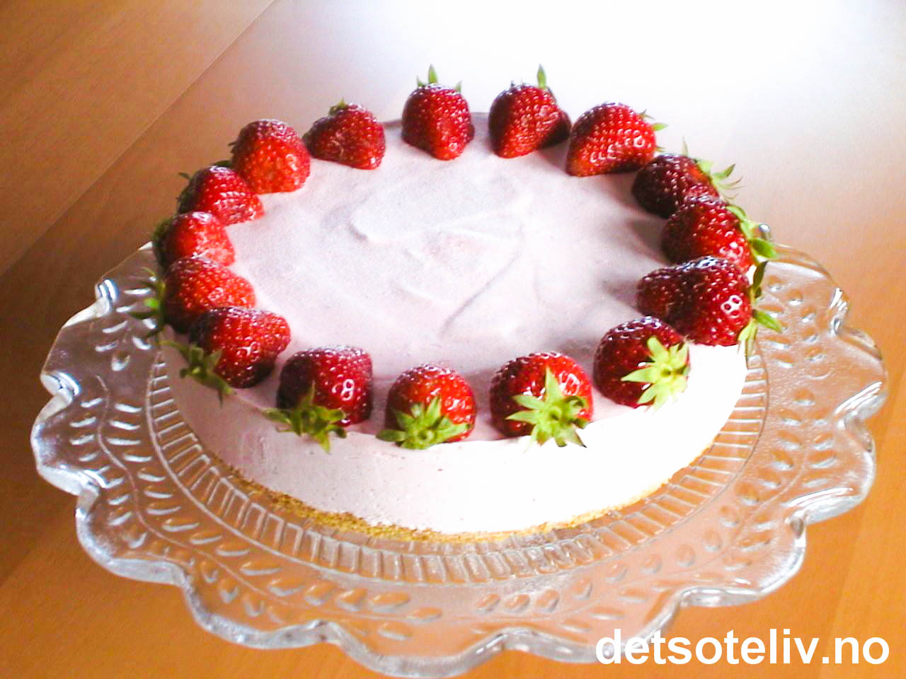 Hell jordbærisen i kakeformen og sett kaken i fryseren. Når kaken er frossen kan den pyntes etter ønske, f.eks. med friske jordbær.