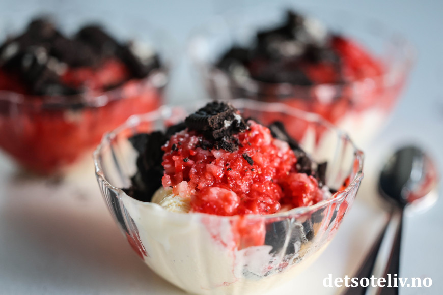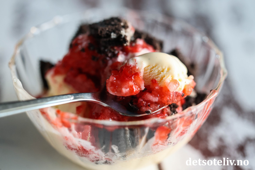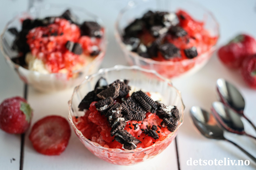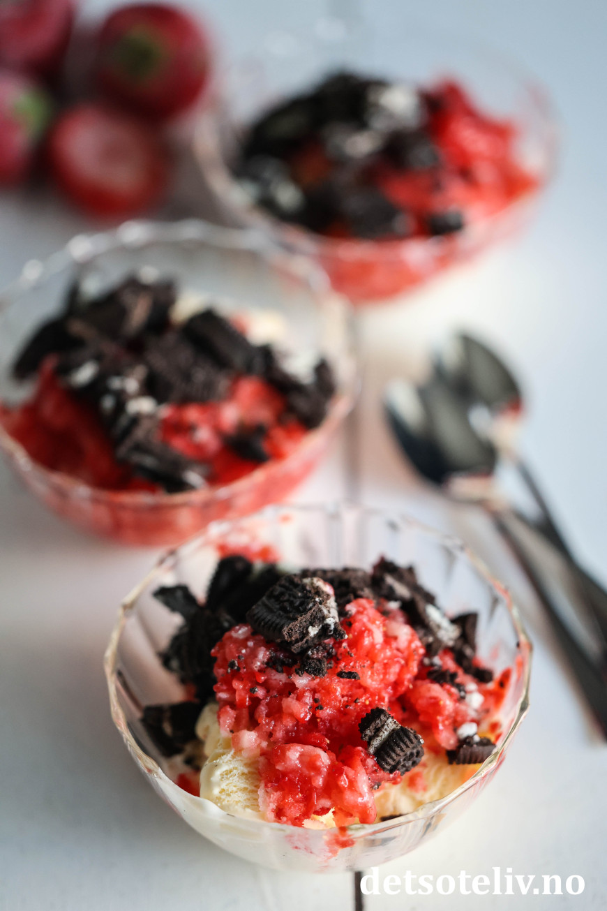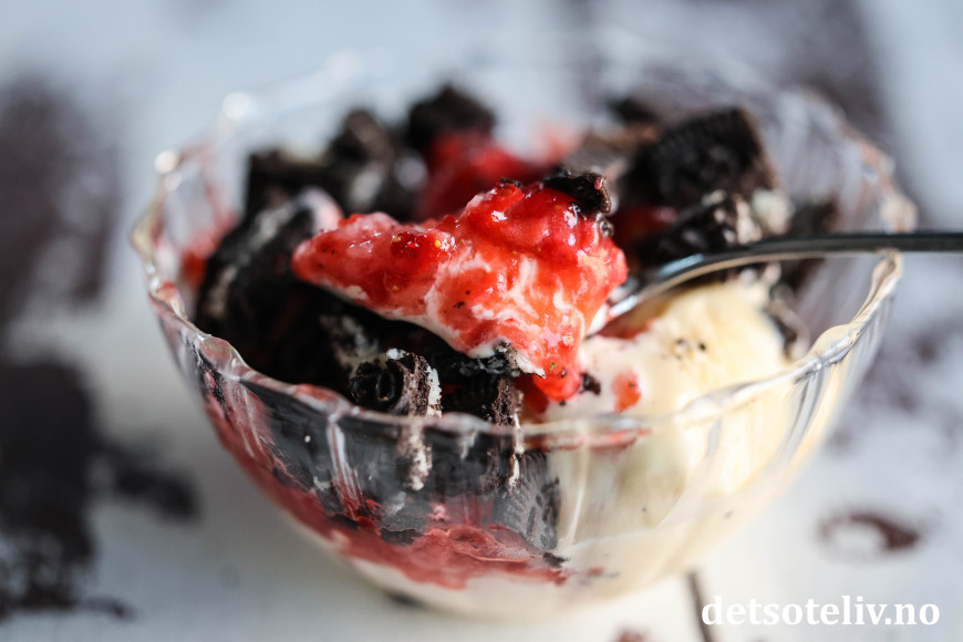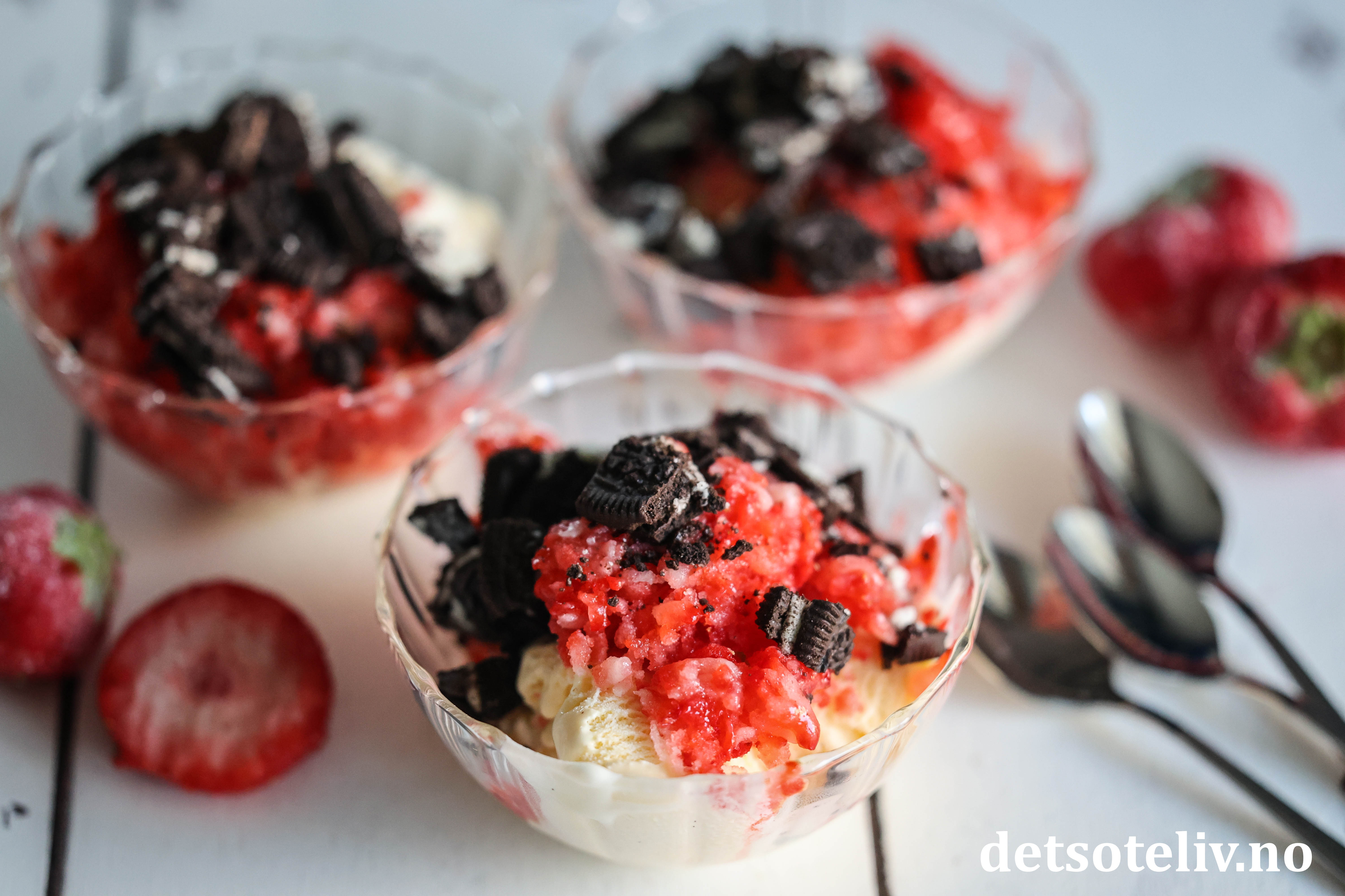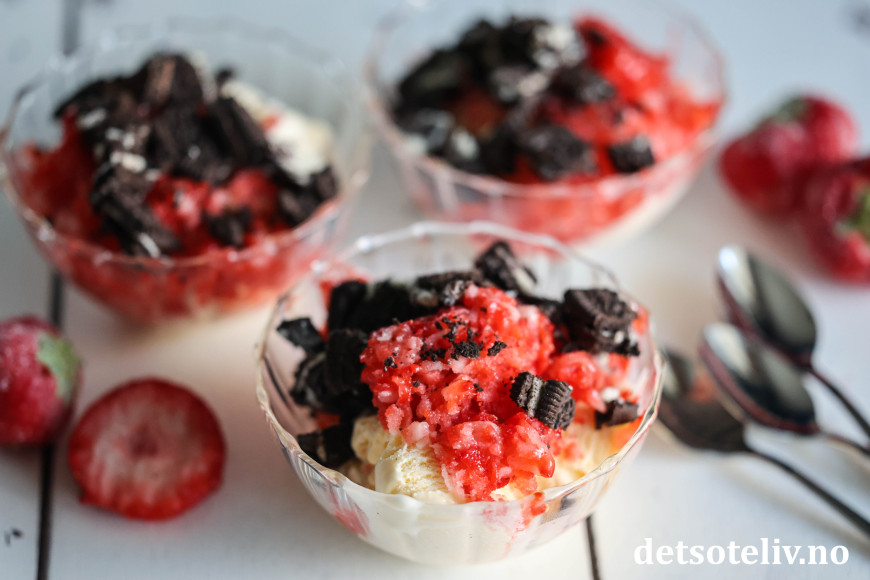 Her har jeg brukt revne, frosne jordbær i kombinasjon med vaniljeis, og så toppet med hakkede Oreos.