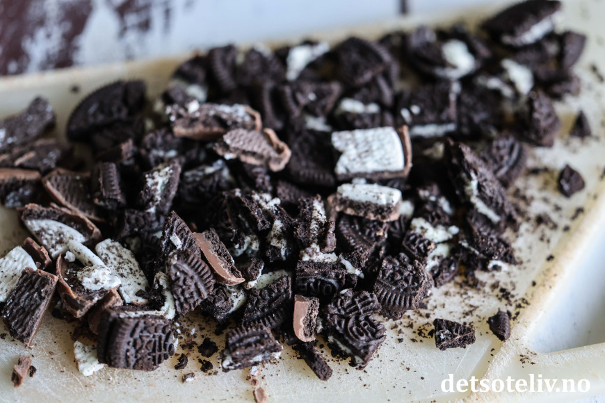 Dryss over grovt hakkede Oreokjeks.