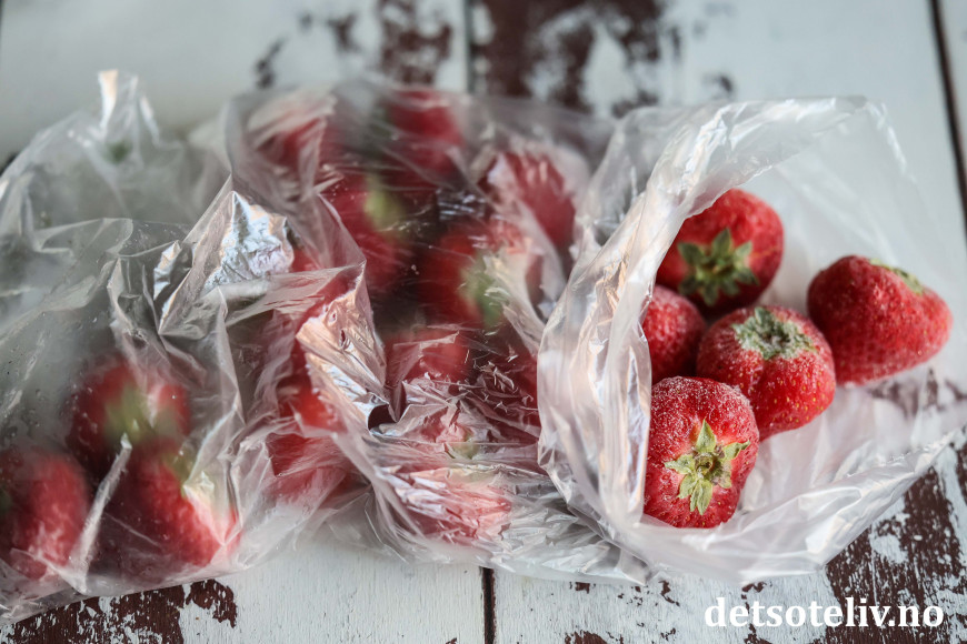 Rett før servering tar du de fryste jordbærene du vil bruke ut av fryseren.