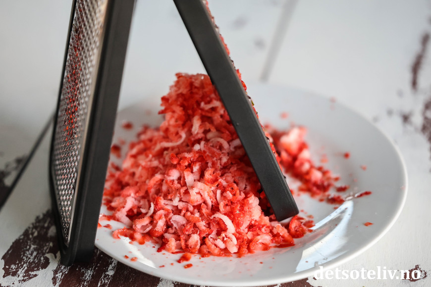 ♥ Det er kaldt å rive frosne jordbær, så det kan være kjekt å ha vanter på fingrene mens du rasper, i hvert fall hvis du skal lage flere porsjoner. 😊