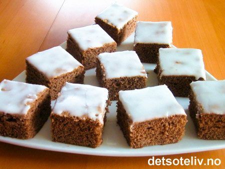 Rør sammen melisglasur (smak eventuelt til glasuren med noen dråper romessens). Smør glasuren jevnt over den kalde kaken ved hjelp av en smørekniv. Del kaken opp i firkanter.