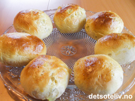 Pisk sammen egget og litt melk med en gaffel og pensle jevnt over bollene. Stek bollene midt i ovnen ved 200°C i ca 15 min, til de er gyldne.