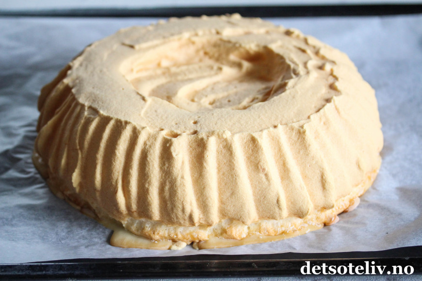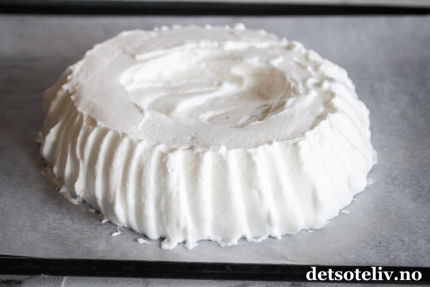 Ha marengsen på en bakepapirdekket stekeplate og form den til en tykk, rund kake. Jeg synes det ser stilig ut når man lager mønster langsmed kanten (jeg bare drar tuppen av en smørekniv eller en teskje oppover langsmed kanten av kaken for å få stripete mønster).