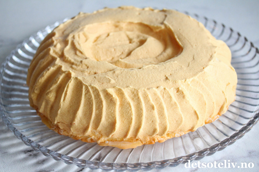 Vær nå forberedt på at utsiden av marengskaken vil være lysegul i fargen. Dette er en konsekvens av å bruke sukrinmelis i stedet for vanlig sukker. På innsiden av kaken vil marengsen imidlertid fortsatt være helt hvit.