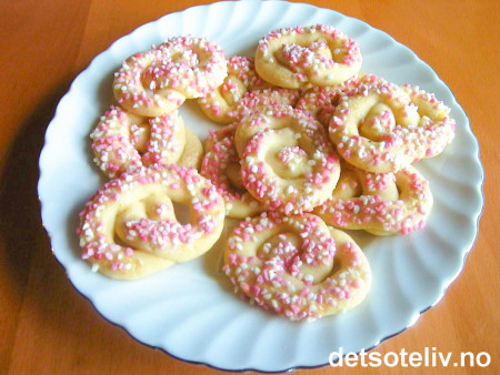 Del deigen opp i 60 emner. Trill hvert emne til tynne pølser som formes til små kringler. Pensle over kringlene med eggehvite og dypp de forsiktig i en skål med rosafarget perlesukker.