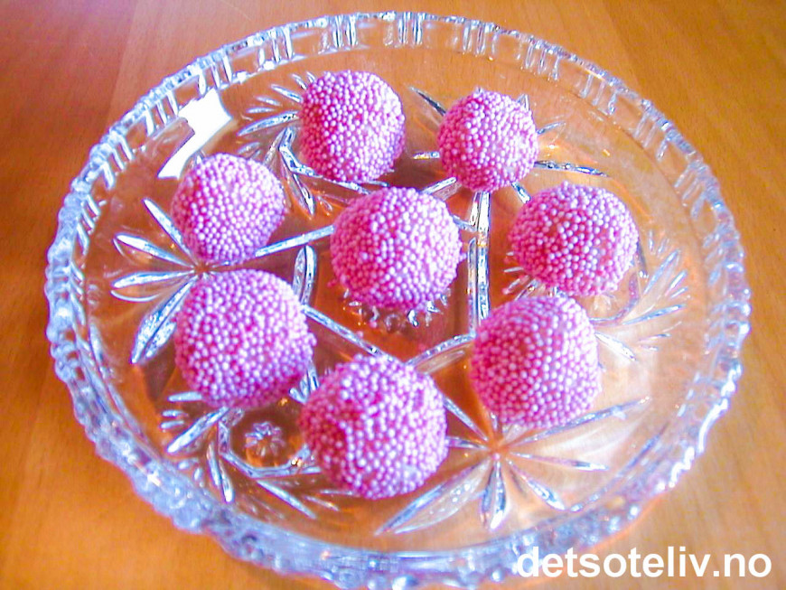Form små kuler (bruk fuktige hender) og rull kulene i sukkerdrysset. Sett kjølig til kulene har stivnet.