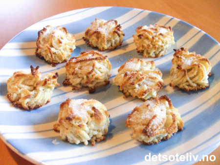 Stekes midt i ovnen ved 220°C i 3-4 min (pass på så kakene ikke blir brente). Avkjøles på rist.
