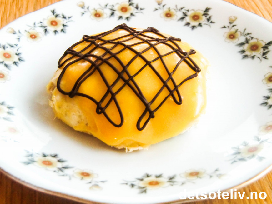 Smelt kokesjokolade sammen med delfiafett. Ringle sjokoladen over den gule kremen på kakene til pynt. Sett kakene kjølig til sjokoladen stivner.