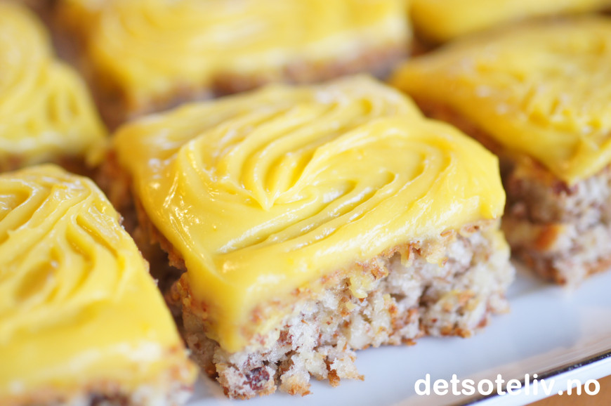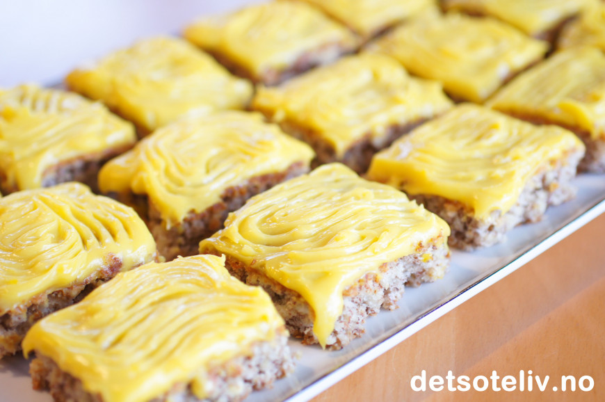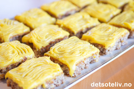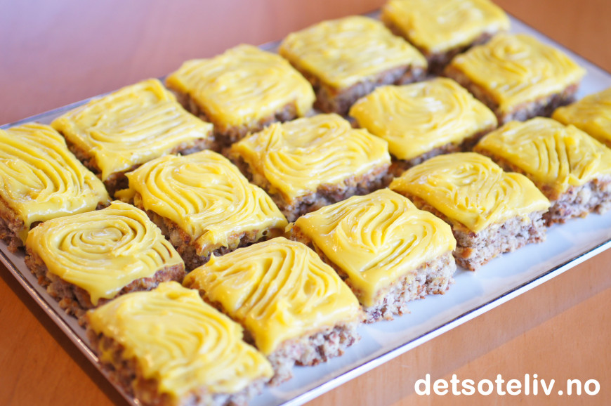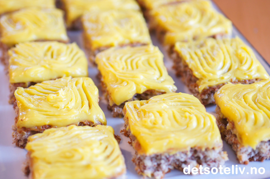 Bre den gule kremen over den avkjølte langpannekaken og del kaken opp i passe store firkanter.