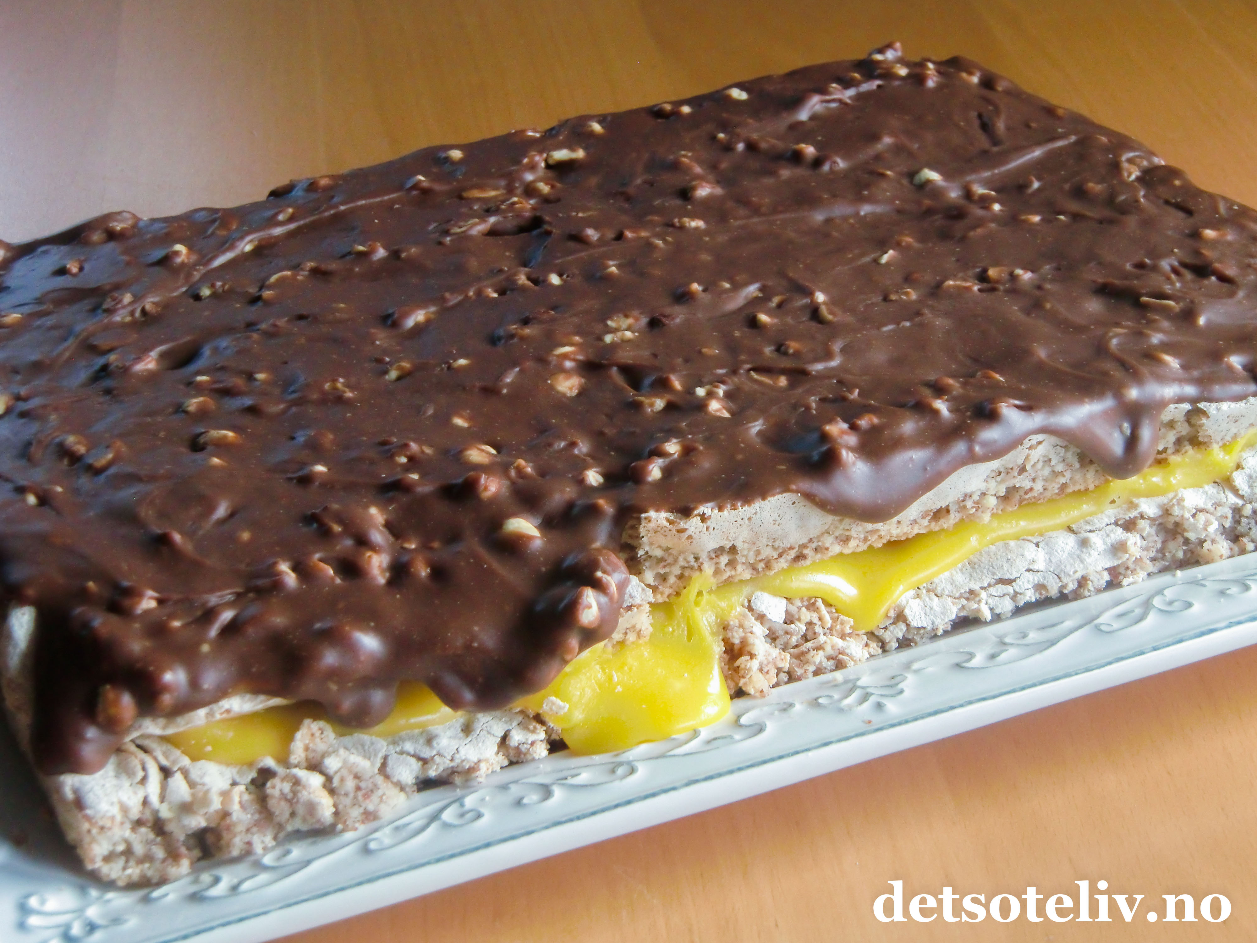 ♥ Det viktige når du lager denne kaken er å få passe konsistens på den gule kremen. Kremen kan bli litt for tynn og begynner da å renne nedover sidene på kakestykkene. For å unngå dette, er det for det første viktig at du lar eggemassen småkoke lenge nok til at den blir skikkelig tykk. Det tar noen minutter. Pass veldig nøye på at den ikke blir brent. Du må røre hele tiden. Deretter er det viktig at du lar den ferdige kremen bli ordentlig kald i kjøleskapet (eller en stund i fryser). Da blir smøret som er i kremen stivt, og kremen dermed tykkere. Kremen kan gjerne stå i kjøleskapet over natten før du har den på kaken.