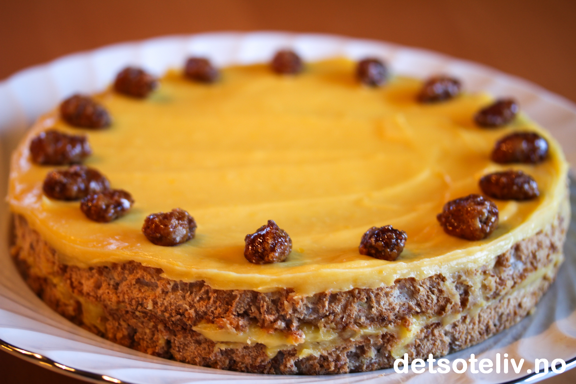 Brente mandler gir mild karamellsmak til denne superdeilige varianten av "Suksesskake"!