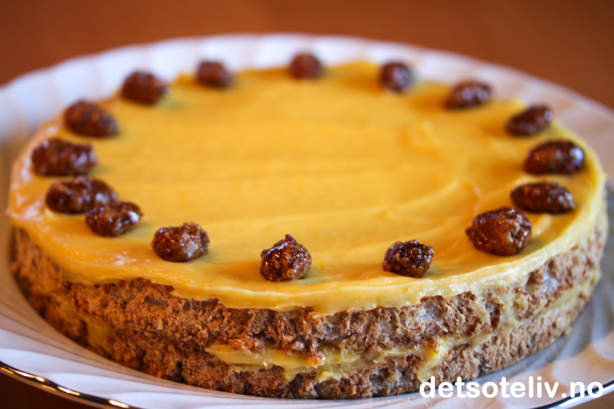 Kle en rund form (22–24 cm) med plastfolie og legg i den ene mandelbunnen. Ha over halvparten av den gule kremen. Legg over den andre mandelbunnen og dekk med resten av den gule kremen. Sett formen i kjøleskapet til dagen etter.