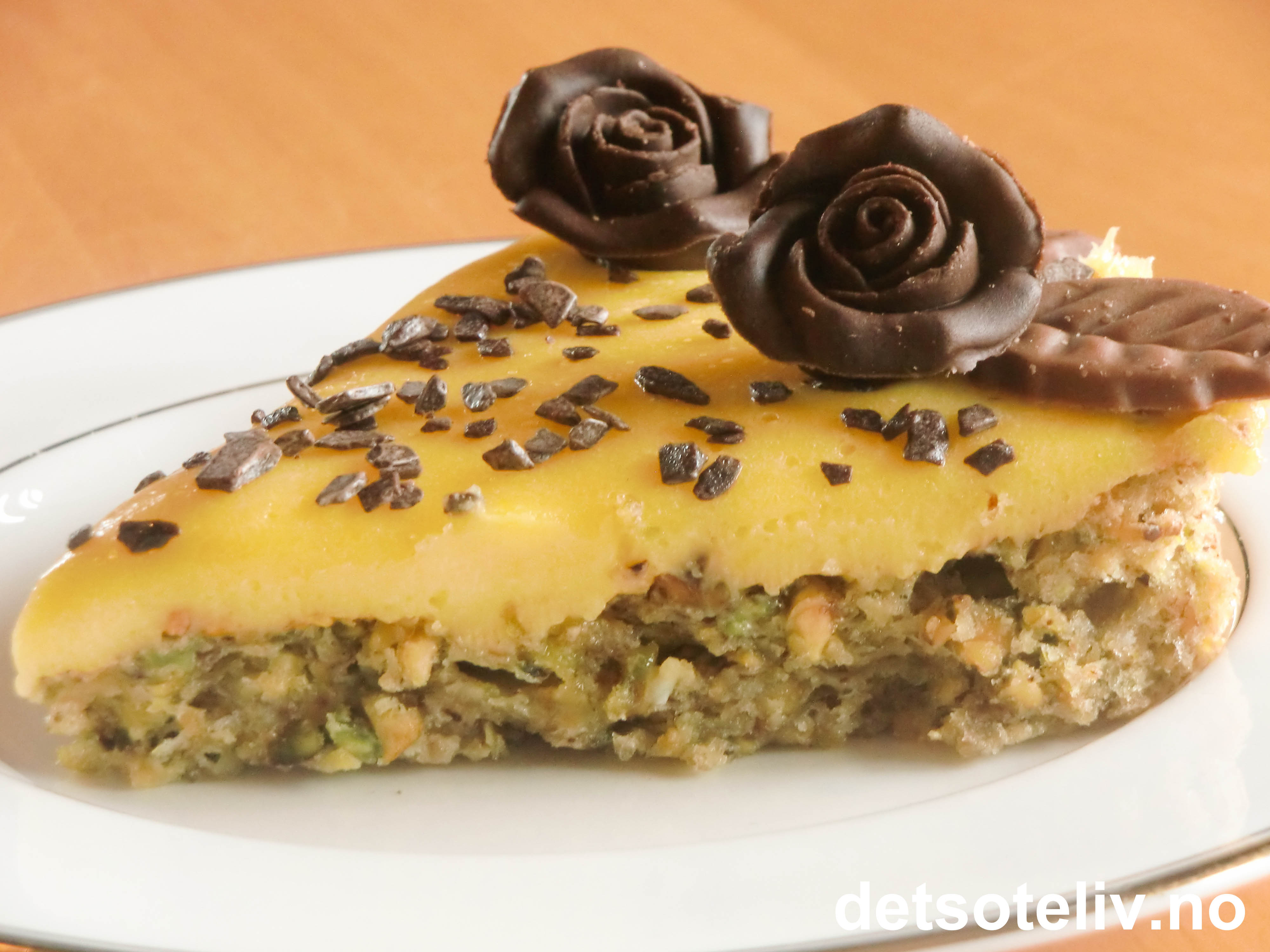 ♥ Jeg har her brukt ferdigkjøpte, brune marsipanroser med sjokoladesmak, men det går fint å bruke annen sjokoladepynt eller hakkede pistasjnøtter.