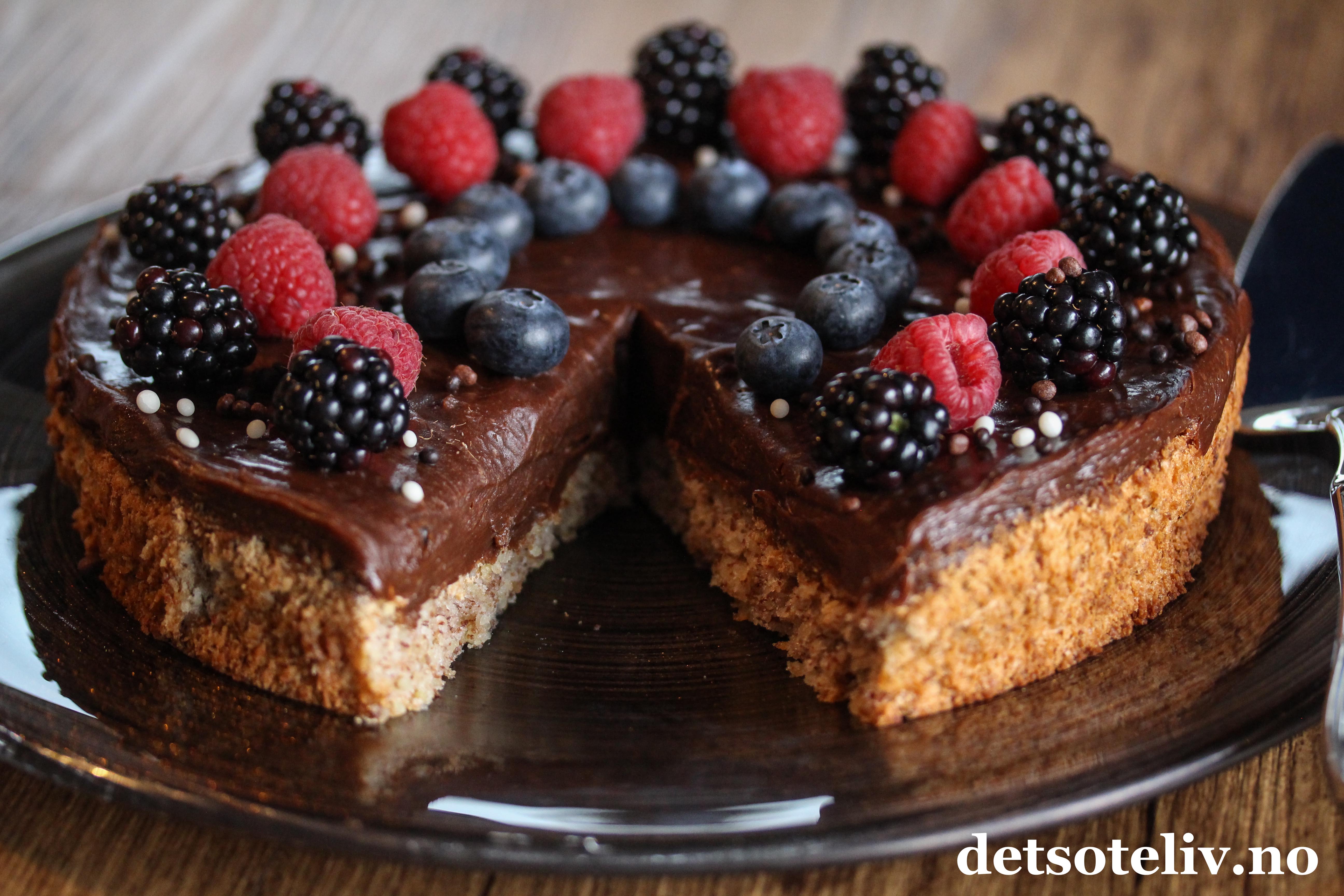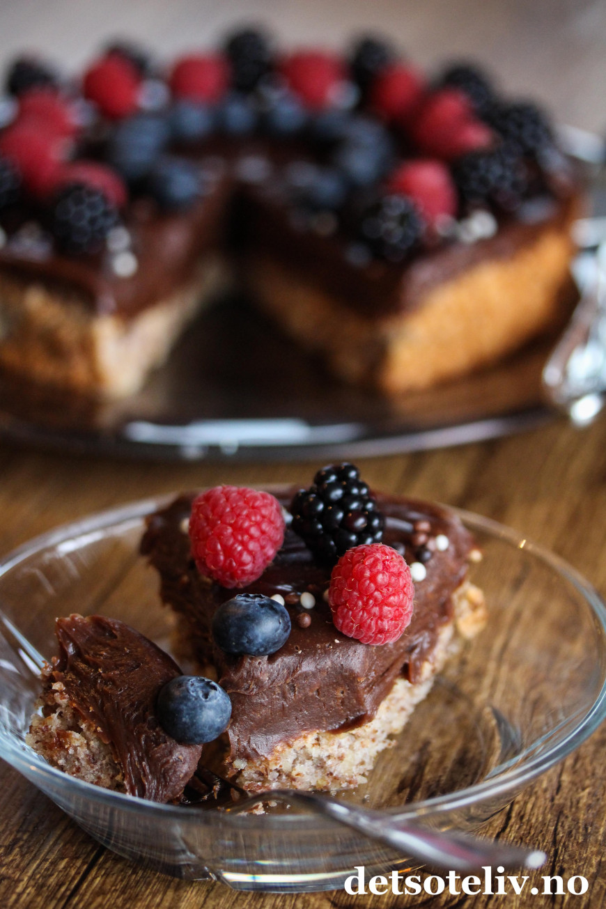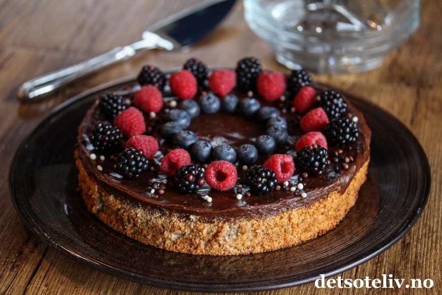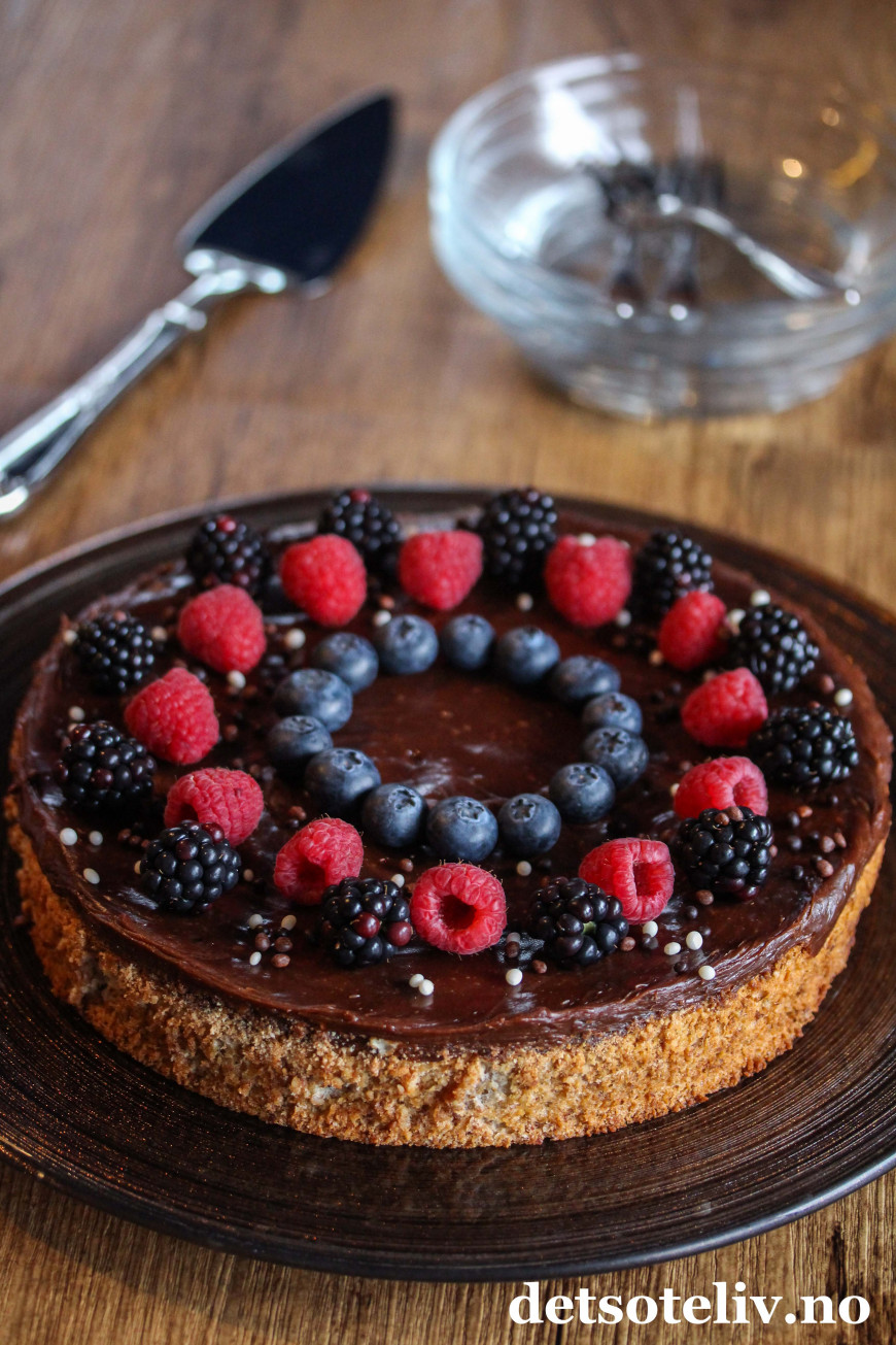 Pynt kaken med friske bær og litt sjokoladestrøssel.